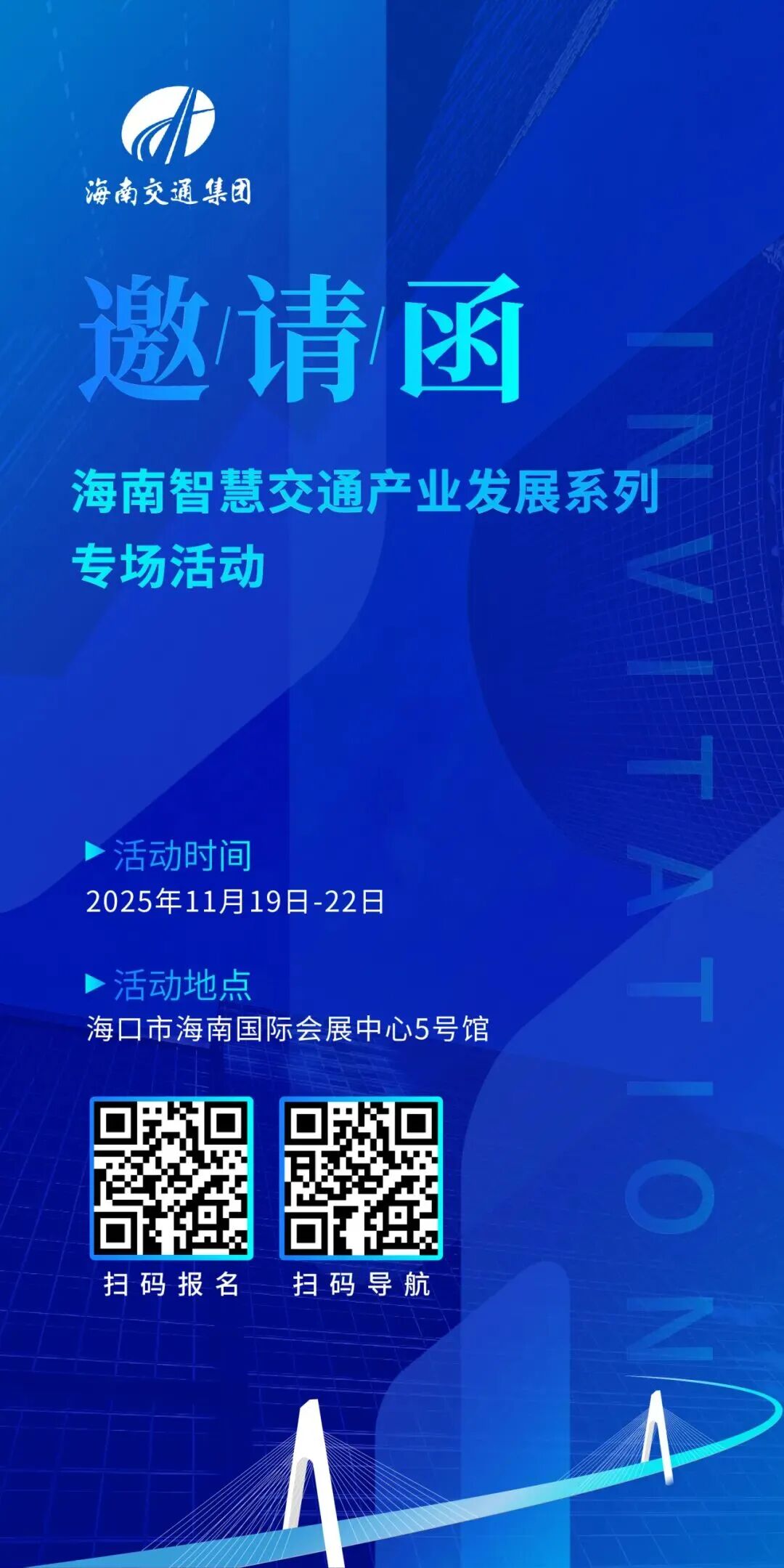 智慧交通,海南机遇,聚焦前沿,共谋发展!海南交通集团诚邀您拨冗出席系列专场活动,与业界精英共话海南智慧交通新未来。席位有限,请速扫码报名! [更多]