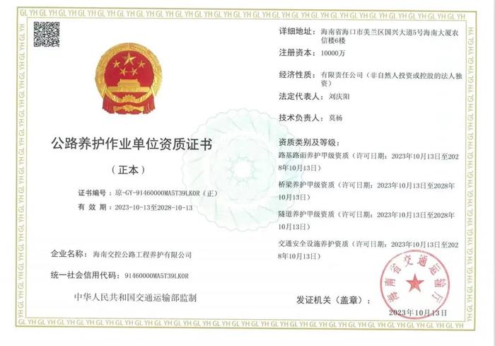 近日,经海南省交通运输厅审批核准,海南交投养护公司一次性取得了四项公路养护作业单位资质,分别为路基路面养护甲级资质、桥梁养护甲级资质、隧道养护甲级资质、交通安全设施养护资质(不分等级)。 [更多]