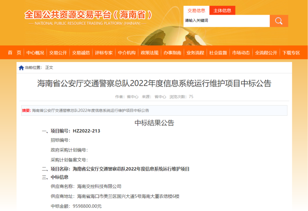近日,经专家评审,海南交控科技有限公司(以下简称交控科技)中标海南省公安交通警察总队2022年度信息系统运行维护项目,中标金额959.88万元。该项目是交控科技中标的首个近千万元的交通领域信息化项目,对公司进一步拓展交通出行、安全监控等政府信息化项目建设领域的业务具有重要意义。 [更多]