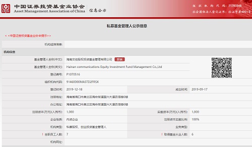 12月19日,海南交控股权投资基金管理有限公司(以下简称“海南交控基金公司”)顺利通过中国基金业协会审核,成为私募基金管理人(编号:P1070516),这标志着海南交控在投融资领域的金融创新与融合发展迈上了新台阶 [更多]