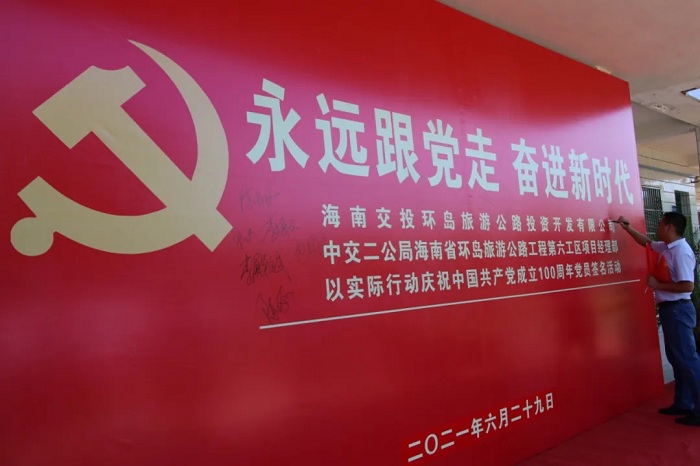 第二阶段,全体党员赴中交二公局环岛旅游路六工区临高分部继续进行“庆建党百年”签名墙签名仪式,共同合唱《没有共产党就没有新中国》。
