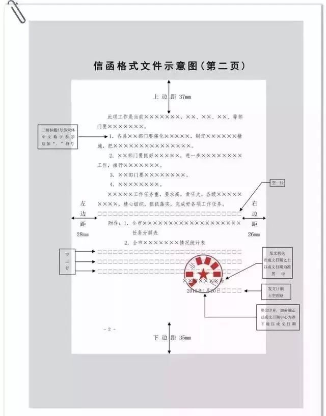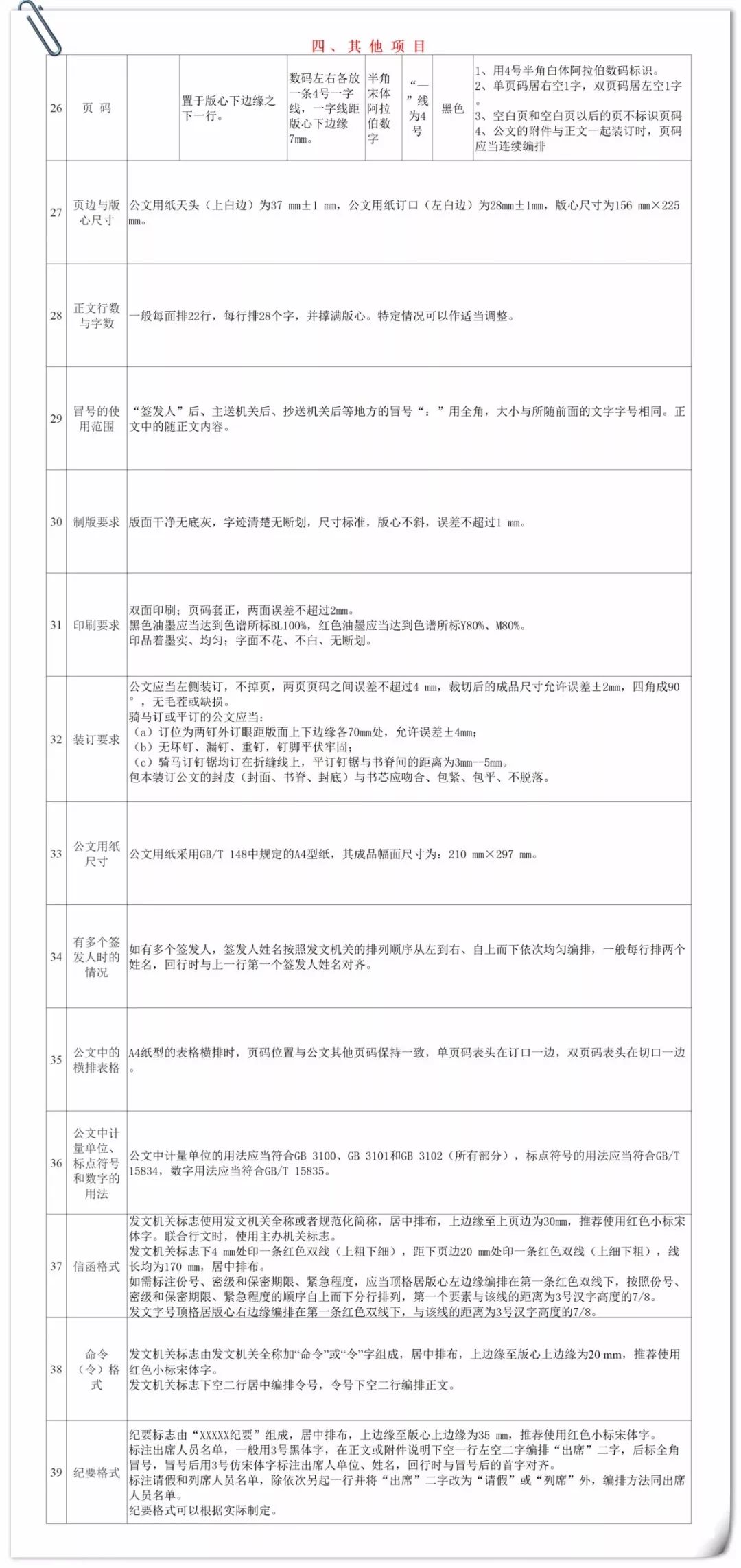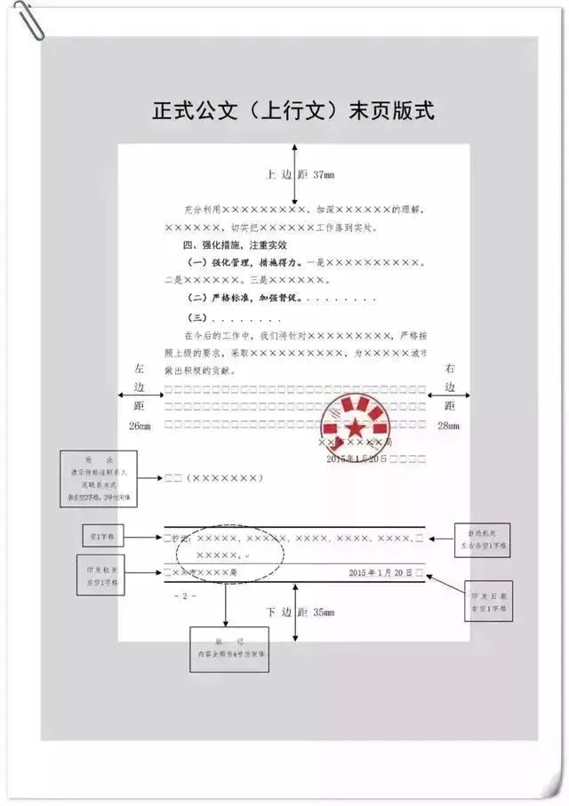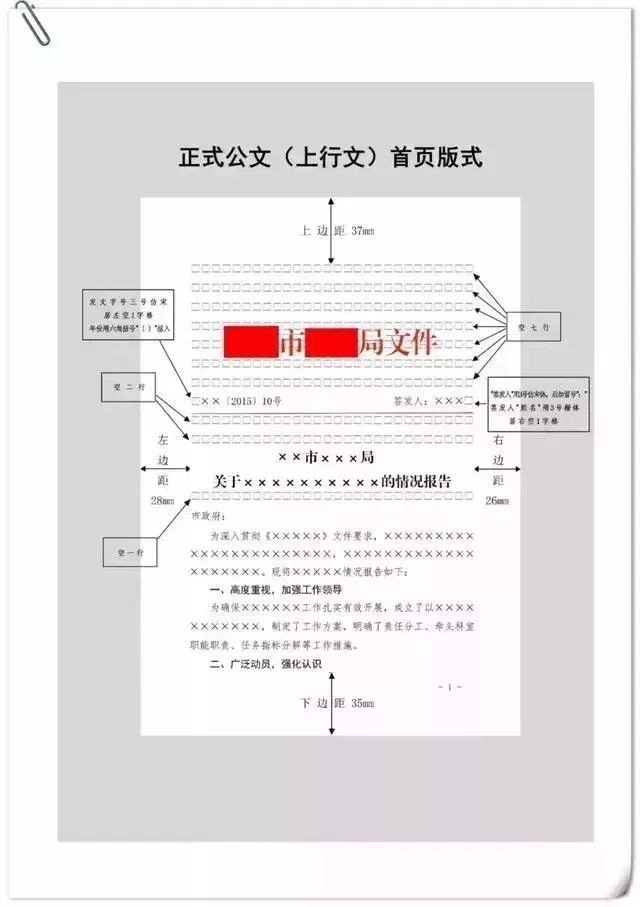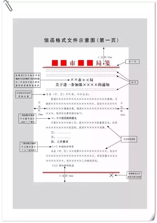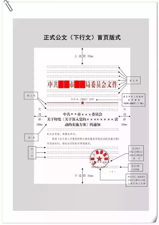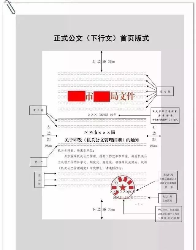 公文用纸天头(上白边)为37 mm±1 mm,订口(左白边)为28mm±1mm,版心尺寸为156 mm×225 mm。