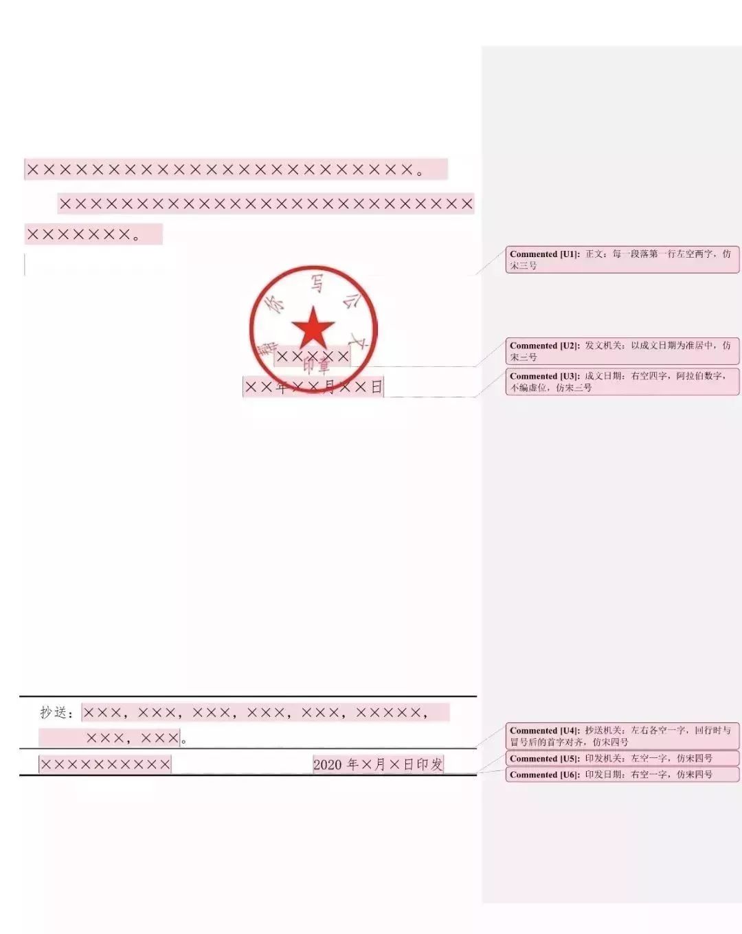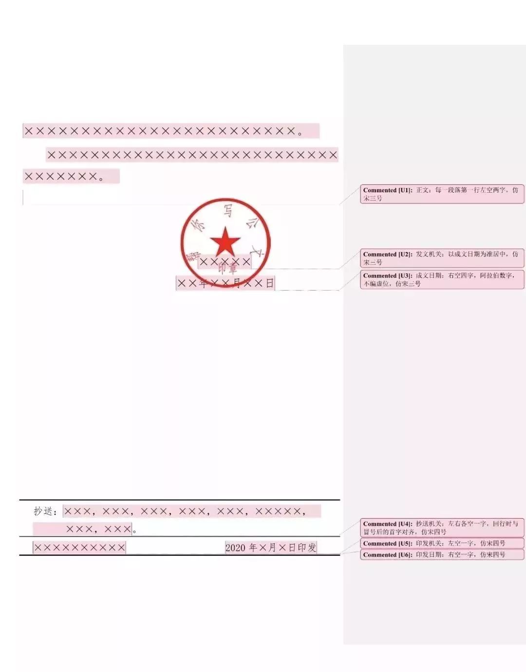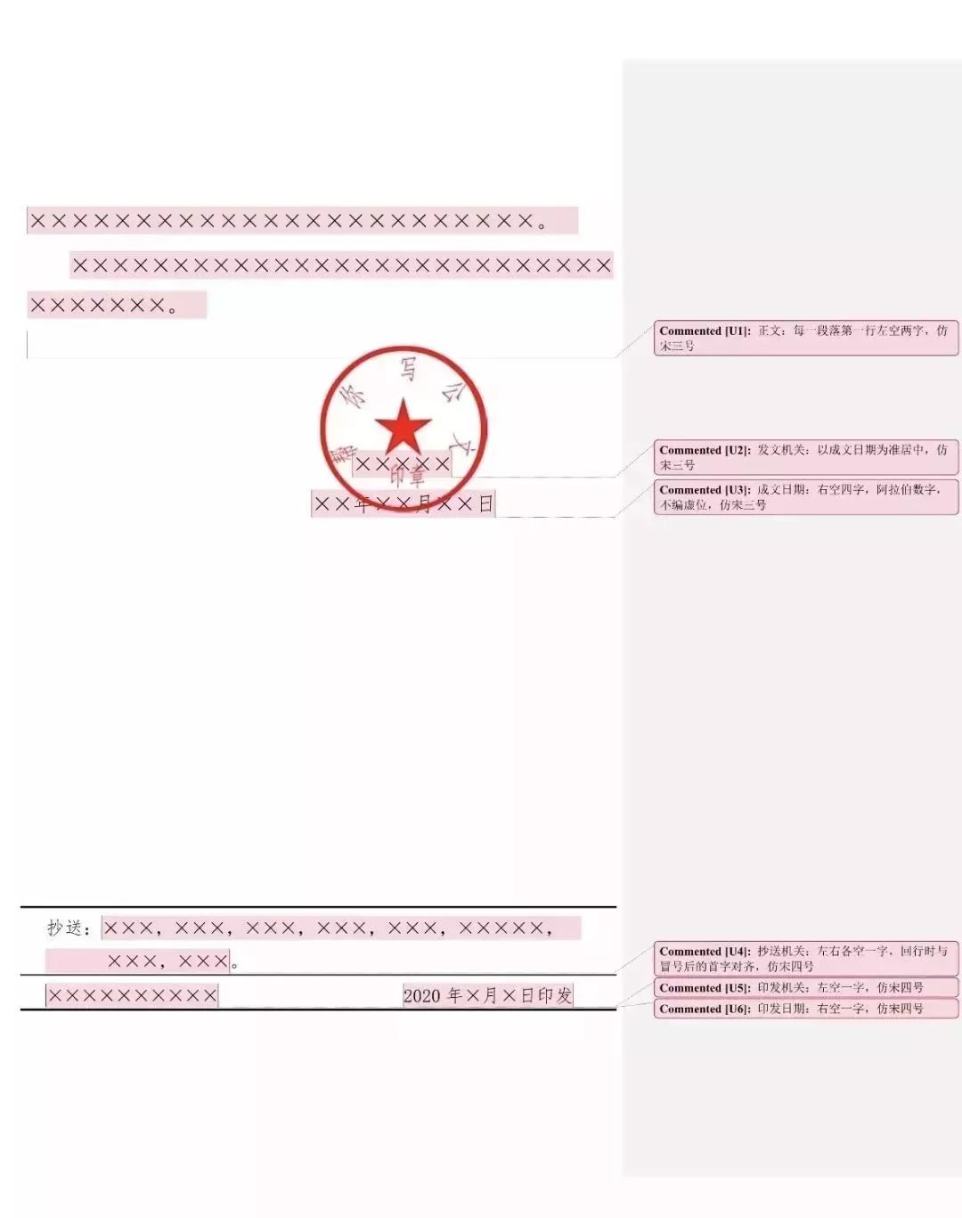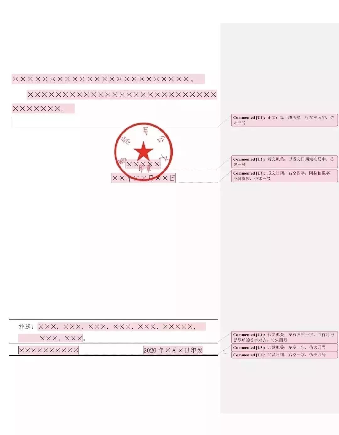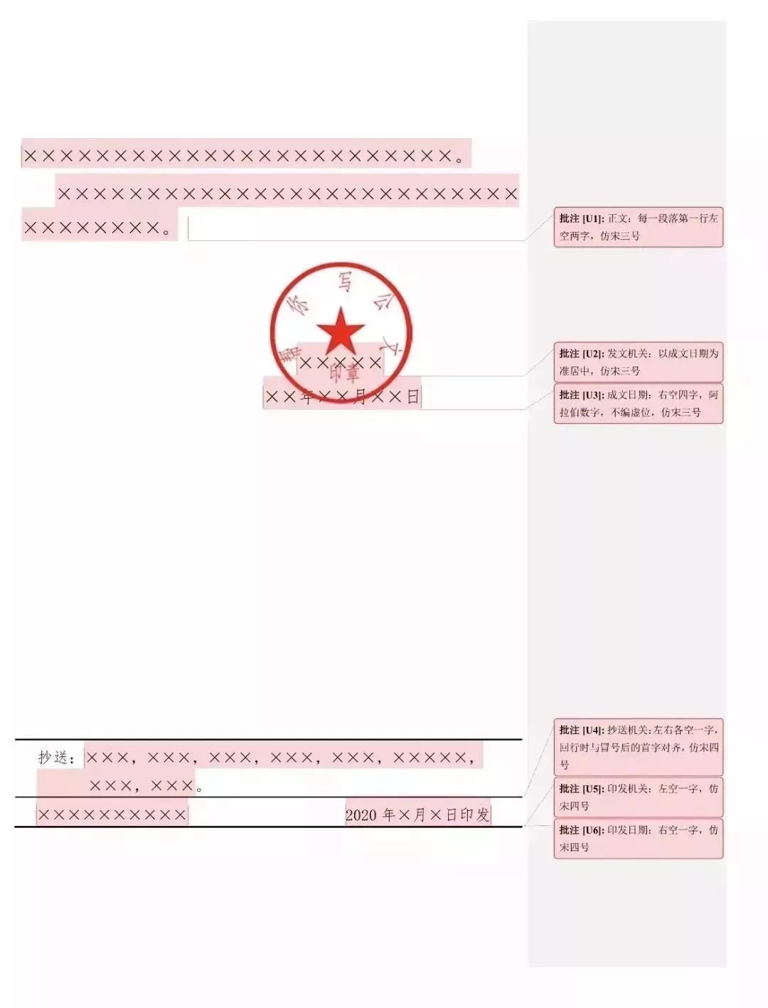 成文日期一般右空四字编排,印章用红色,不得出现空白印章。