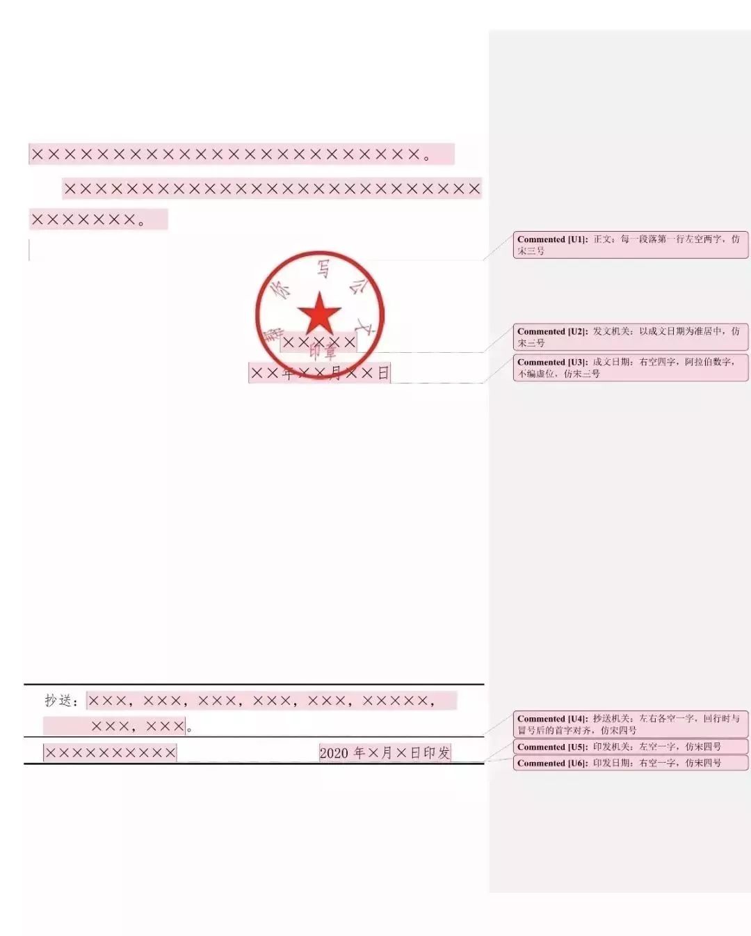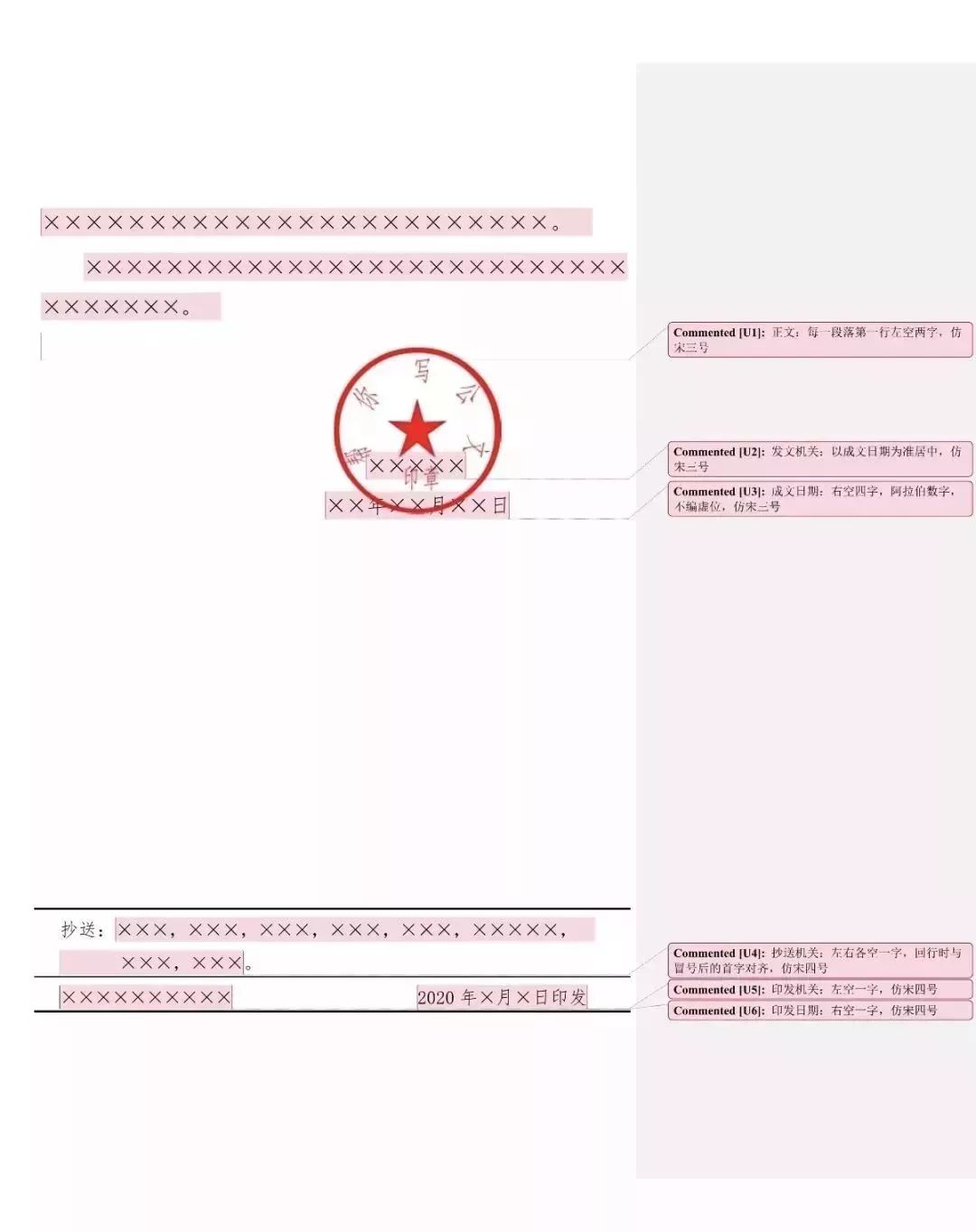 如有抄送机关,一般用4号仿宋体字,在印发机关和印发日期之上一行、左右各空一字编排。“抄送”二字后加全角冒号和抄送机关名称,回行时与冒号后的首字对齐,最后一个抄送机关名称后标句号
