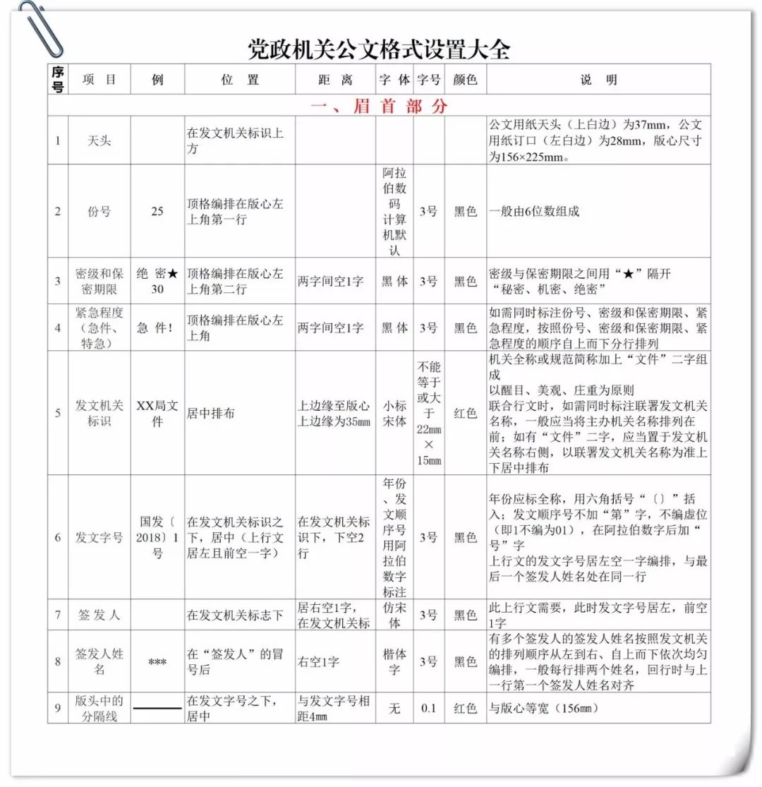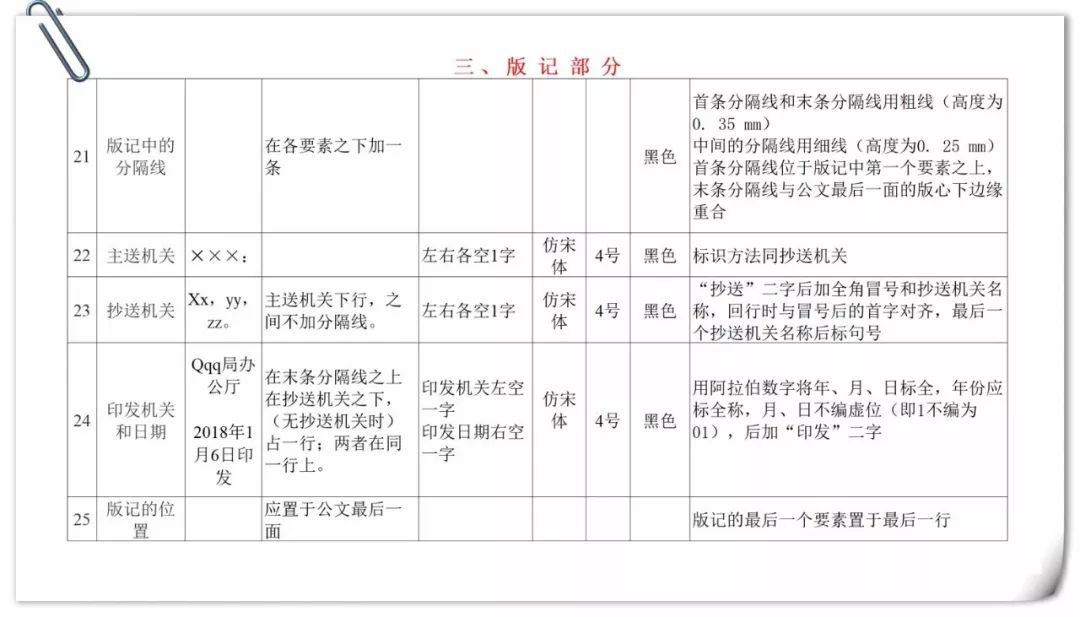 标准将版心内的公文格式各要素划分为版头、主体、版记三部分。公文首页红色分隔线以上的部分称为版头;公文首页红色分隔线(不含)以下、公文末页首条分隔线(不含)以上的部分称为主体;公文末页首条分隔线以下、末条分隔线以上的部分称为版记。