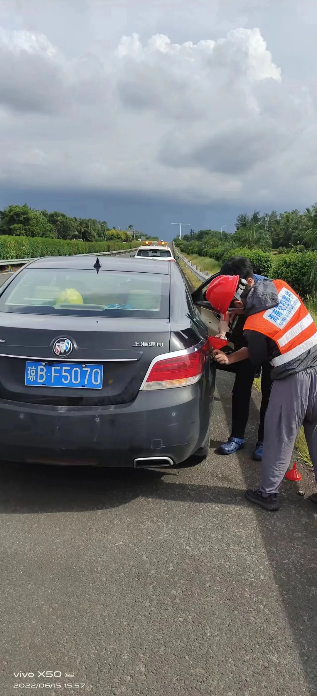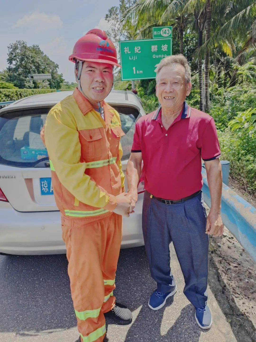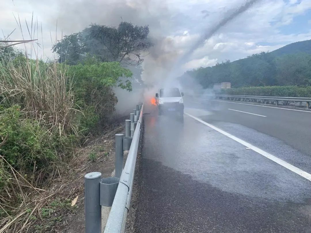 陵水站“车轮上党小组”蔡亲宇作业途中发现一辆小货车自燃,帮忙其灭火