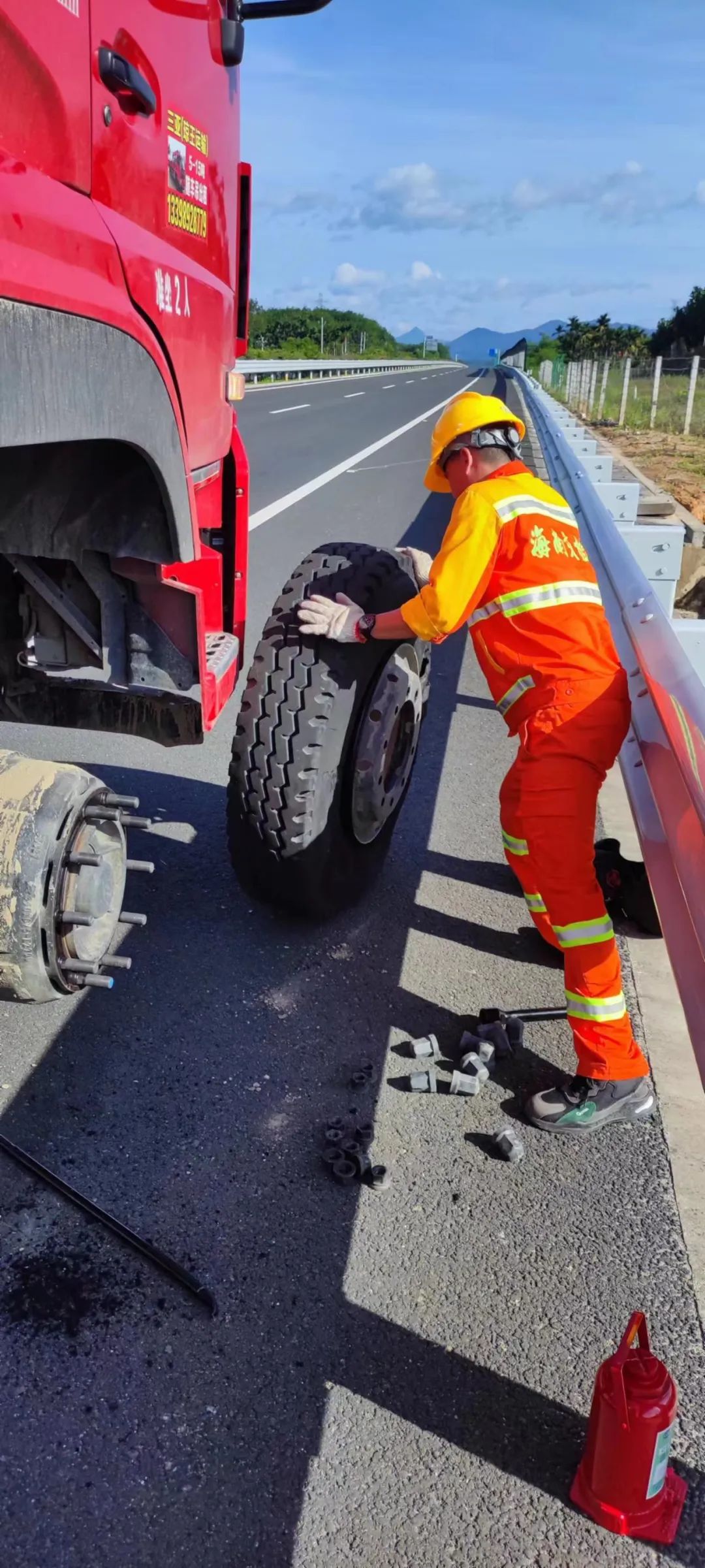 万宁站“车轮上党小组”周雷帮助车主更换轮胎