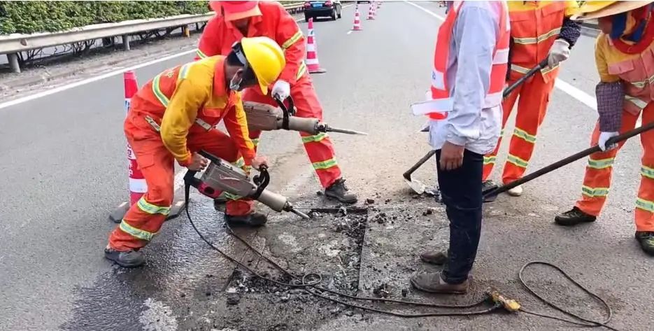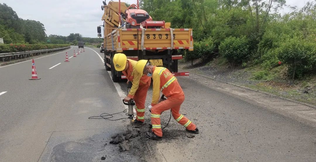 小暑已至,即将入伏。为抢抓高温时节有利的作业条件,保障高速公路行车安全,每到夏天,养护管理站都会对路面坑槽此类安全隐患进行日常的排查抢修。在160多摄氏度的摊铺现场,机声隆隆,路面铣刨和沥青摊铺正在热火朝天地紧张施工,一股股热浪不时从脚底袭来直冲头顶,刺鼻的沥青气味更是令人难以呼吸。即便如此,对于莫庆俊和他的同事们来说,这是最佳的施工环境,他们迎“热”而上,挥动着铁锹平整沥青料,以便压路机进行压实,黝黑的脸庞上汗水直流,身上的工作服一边被汗水打湿一边又被烈日烤干。“高温天气是高速公路路面摊铺的黄金时期,气温越高,越有利于沥青摊铺,才能避免沥青温度损失,更好地保障路面压实效果。”莫庆俊擦了擦脸上的汗水,又继续投入作业中。