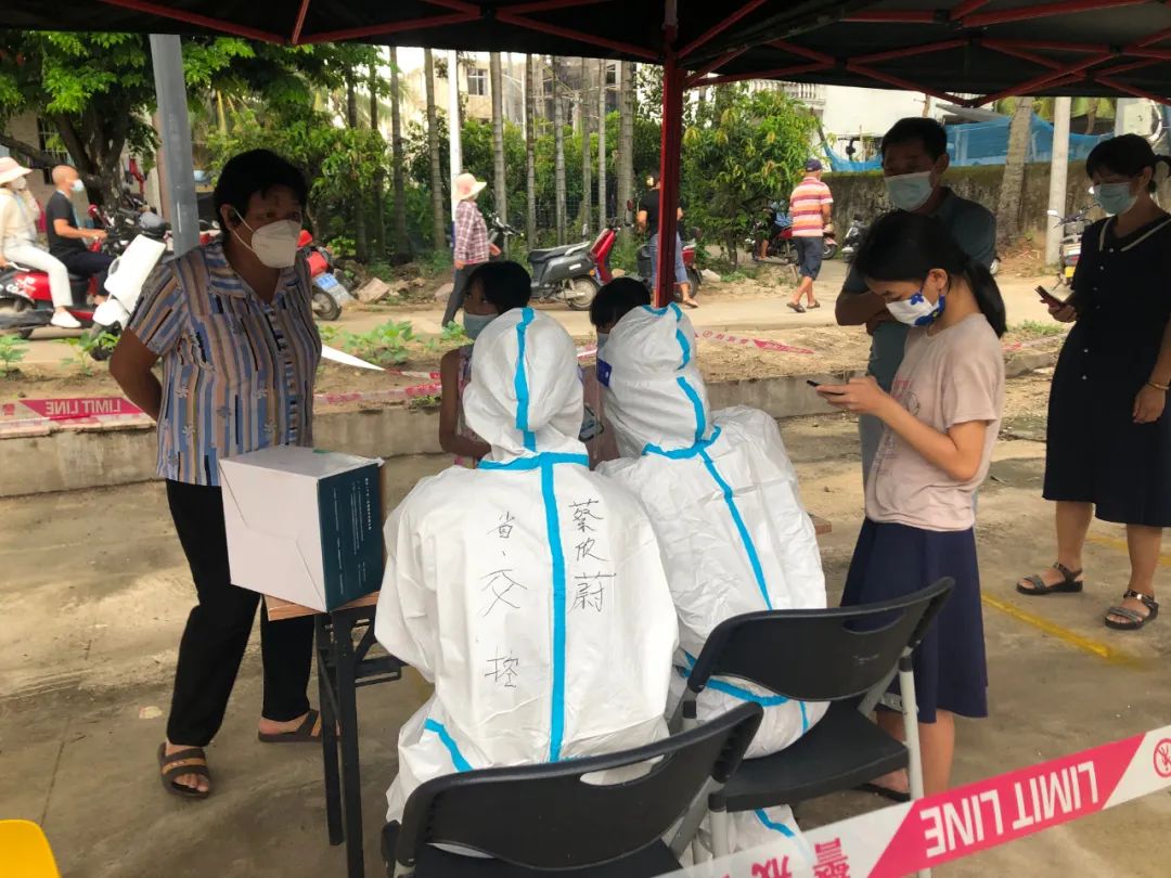 8月15日晚,在接到区委组织部的紧急调令后,“黄金小队”一行迅速收拾行李“转移阵地”,支援“大型高风险战场”儋州村社区。根据疫情防控指挥部的工作要求,高风险地区必须入户完成“单人单管”采样。为了携带更多采样试管、提高采样效率,蔡欣蔚带着队员利用物资包装纸箱,自制易消杀处理的一次性“小药箱”,有了“定制装备”,蔡欣蔚一次可以携带核酸检测耗材百余套,一个上午就能配合医务人员完成100余人次的核酸采样,“黄金小队”全队每日可完成采样约600人次。
