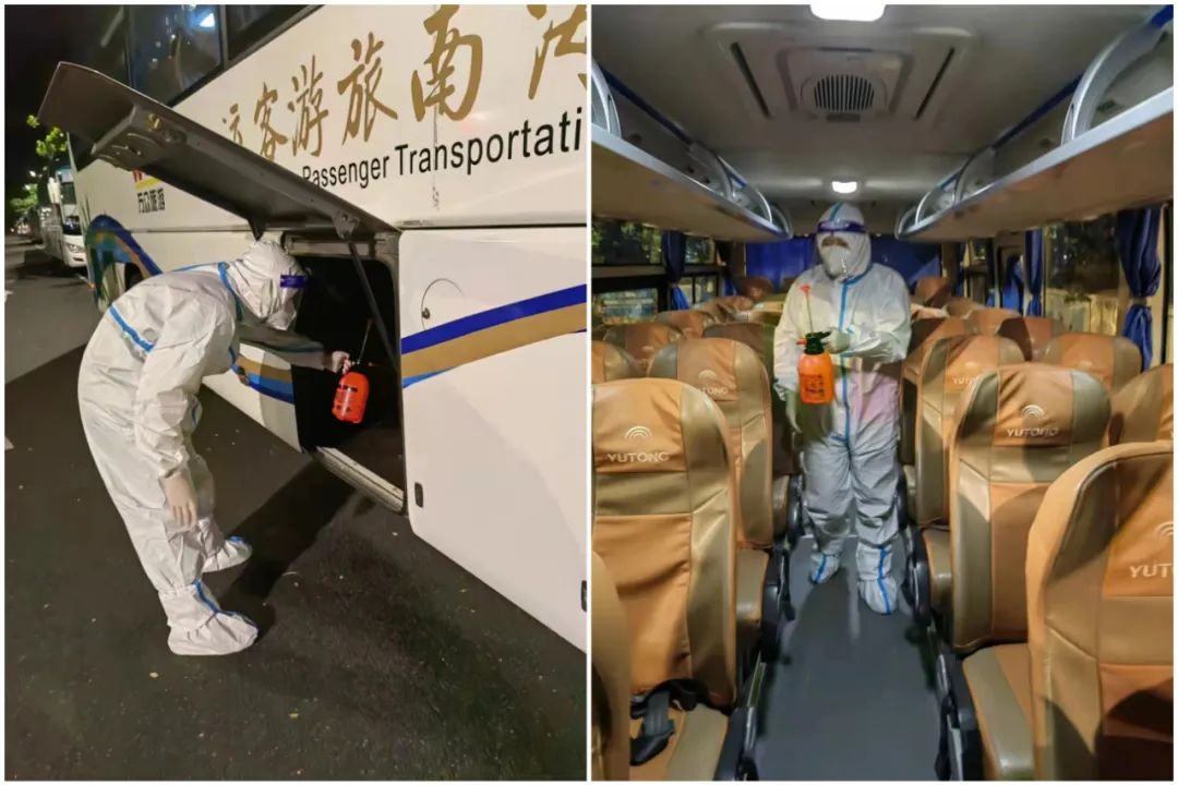 志愿者的细心和耐心是用责任心来书写的。旅客下车后,符恺马上进行全车消毒,不给病毒传播留下时间,保障下一批旅客的乘车安全。在近40度的高温炙烤下,没过一会儿,汗水就浸湿了衣服,每天还要穿着密闭的防护服连续工作8到9个小时,说不累是假的。累了就坐路边休息一下,刚开始难免不适应,口罩把符恺的耳朵勒得发红起泡,他说“等结痂长茧就不疼了”。