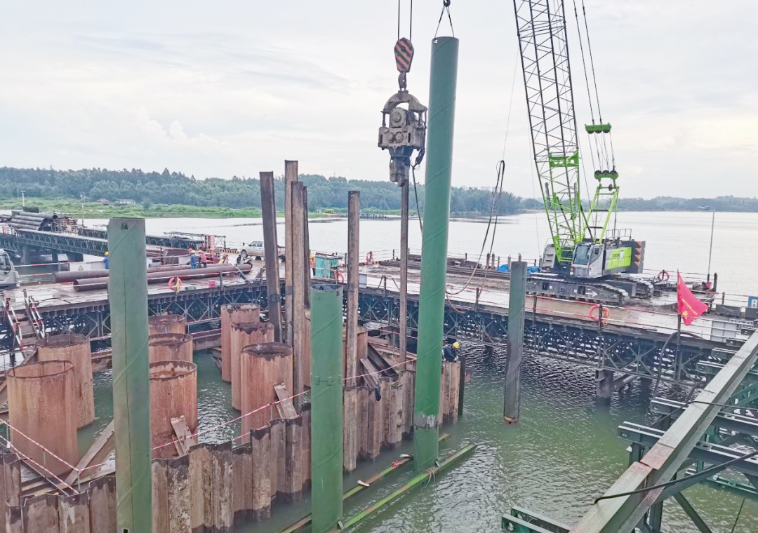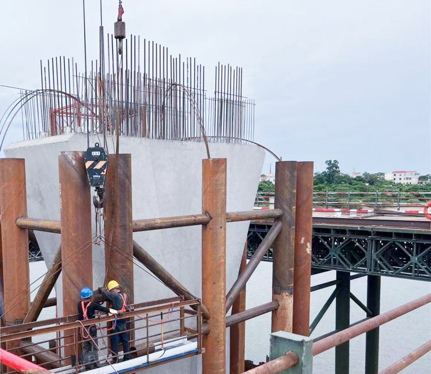 9月8日,在环岛旅游公路项目六工区文澜江大桥施工现场,工人正抓紧进行14号墩盖梁钢筋安装及绑扎。项目一面克服雨季施工困难,另一面仍要面对属地市县跨区域严防严控的防疫形势。