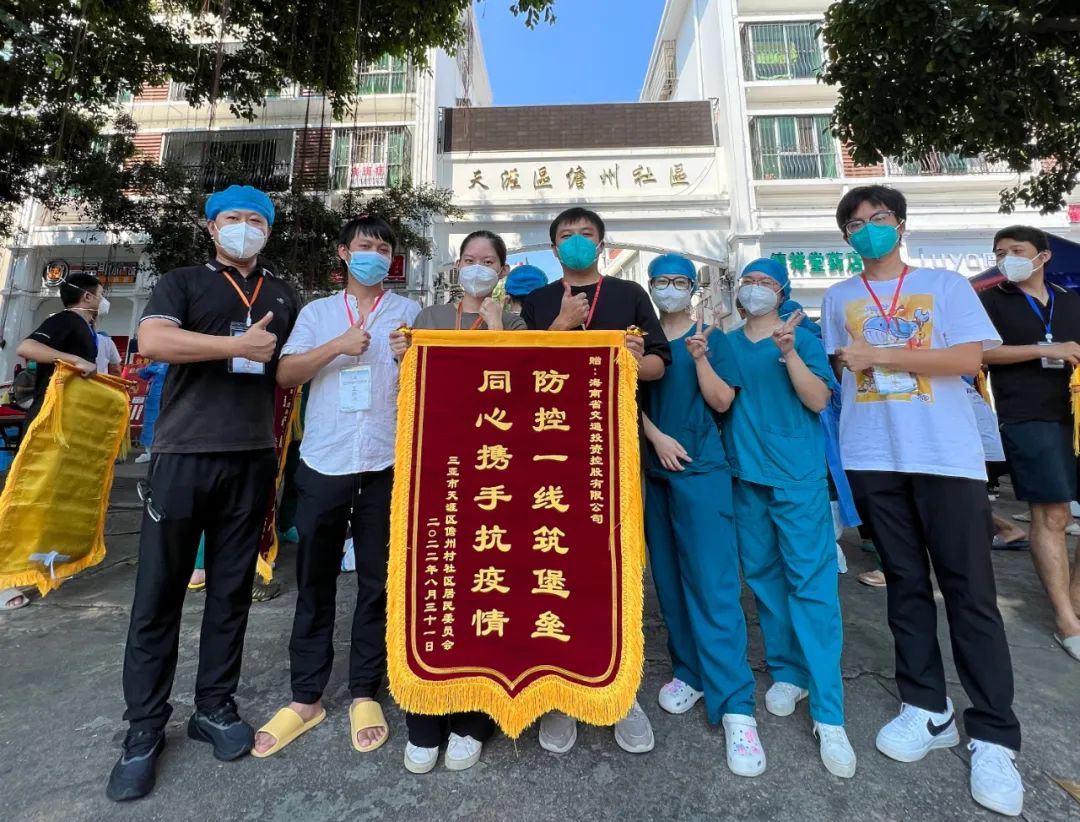 在三亚市天涯区儋州村社区,这是三亚疫情最为严重的地区,儋州村社区居委会为海南交控5名抗疫志愿者隆重颁发“防控一线筑堡垒,同心携手抗疫情”荣誉锦旗。他们是公司第一批志愿者,自8月7日紧急驰援三亚以来,他们顽强坚守在抗疫一线,已整整奋战37天,他们是先锋战士,他们是无名英雄,他们以血肉之躯和坚韧不拔的意志筑起了天涯区最坚固的堡垒。