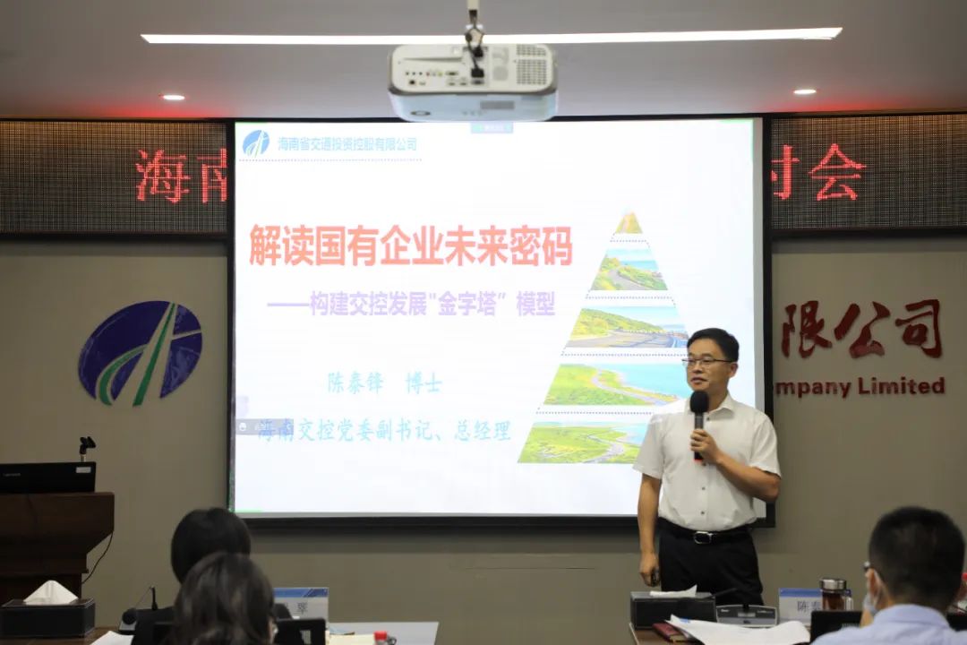 陈泰锋以“解读国有企业未来密码——构建交控发展‘金字塔’模型”为主题,从国有企业功能分类和区别、地方政府融资平台发展历程、构建交控发展“金字塔”模型、解读《海南交控高质量发展实施纲要(2022-2025)》四个方面,结合具体案例,给全体干部职工带来了一场精彩的讲座。