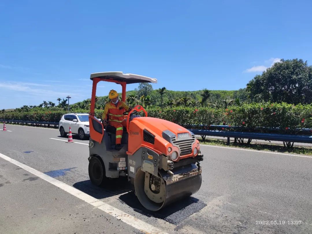随着高速公路通车年限的增长以及交通量的不断增加,沥青路面各种病害也接踵而至,郑杰在热浪滚滚的公路上化身为“美容师”。在修补沥青路面坑槽的前一天,他已和定安管理站提前对接沥青混合料生产相关事宜,以便当天清早迎接装有沥青混合料的保温车。伴随机械设备的轰鸣声,郑杰和站里的同事热火朝天地施工。郑杰采用“圆洞方补、斜洞正补”的方式对坑槽进行切割、凿除,并清理干净碎渣,用乳化沥青洒布粘层。在等待破乳之后,他将沥青混合料进行均匀摊铺,仔细确认摊铺的平整度。郑杰肯下功夫勤于练习,成为站里的机械操作能手,在驾驶压路机压实路面这样的熟练环节丝毫不分神。在等待沥青混合料温度下降这段时间里,他满脸都是汗水,不时模糊双眼,“我们经常这样免费蒸桑拿的”,他打趣地说道。