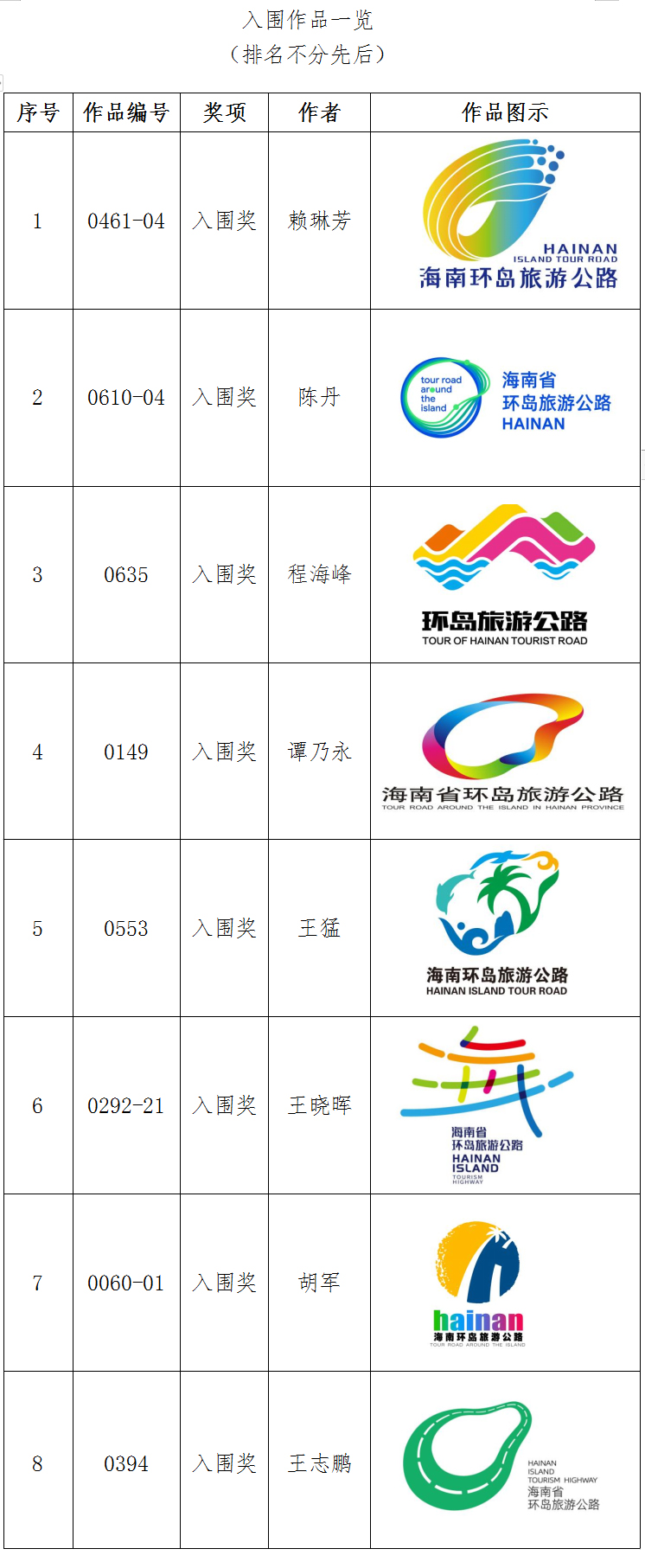 为打造传世之作,更好地宣传推介海南省环岛旅游公路,提升最美丽公路、最现代化公路的独特魅力和丰富内涵,海南交控面向社会各界公开征集海南环岛旅游公路形象标识(Logo)设计方案。征集活动开展以来,受到社会各界的高度关注和积极参与,收到来自设计师、设计机构、高校师生等作品近千件。经评审专家初评、复评、终评严格筛选,综合网络人气投票情况,共评选出8件入围作品,优胜奖、优秀奖空缺,现将获奖作品予以公示。