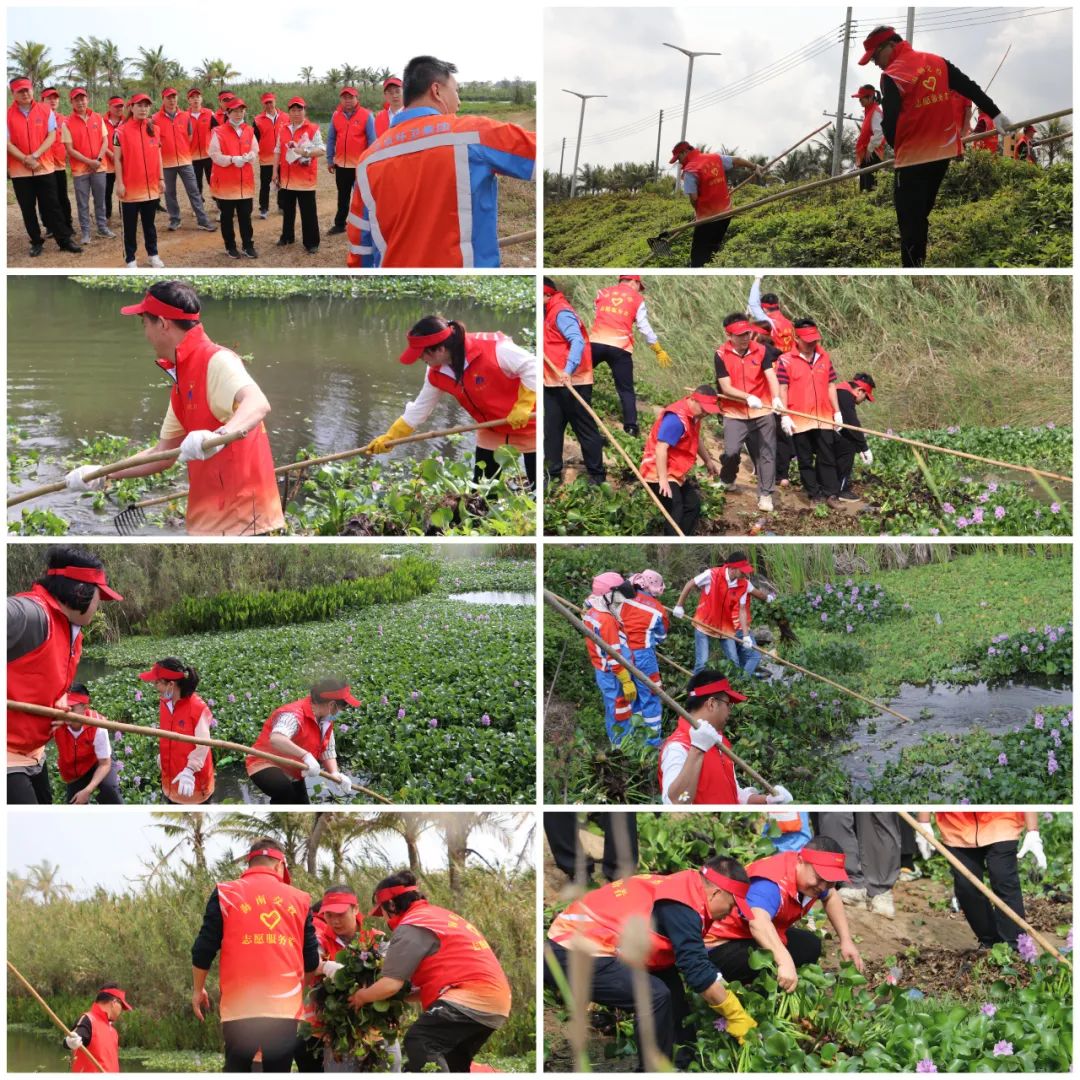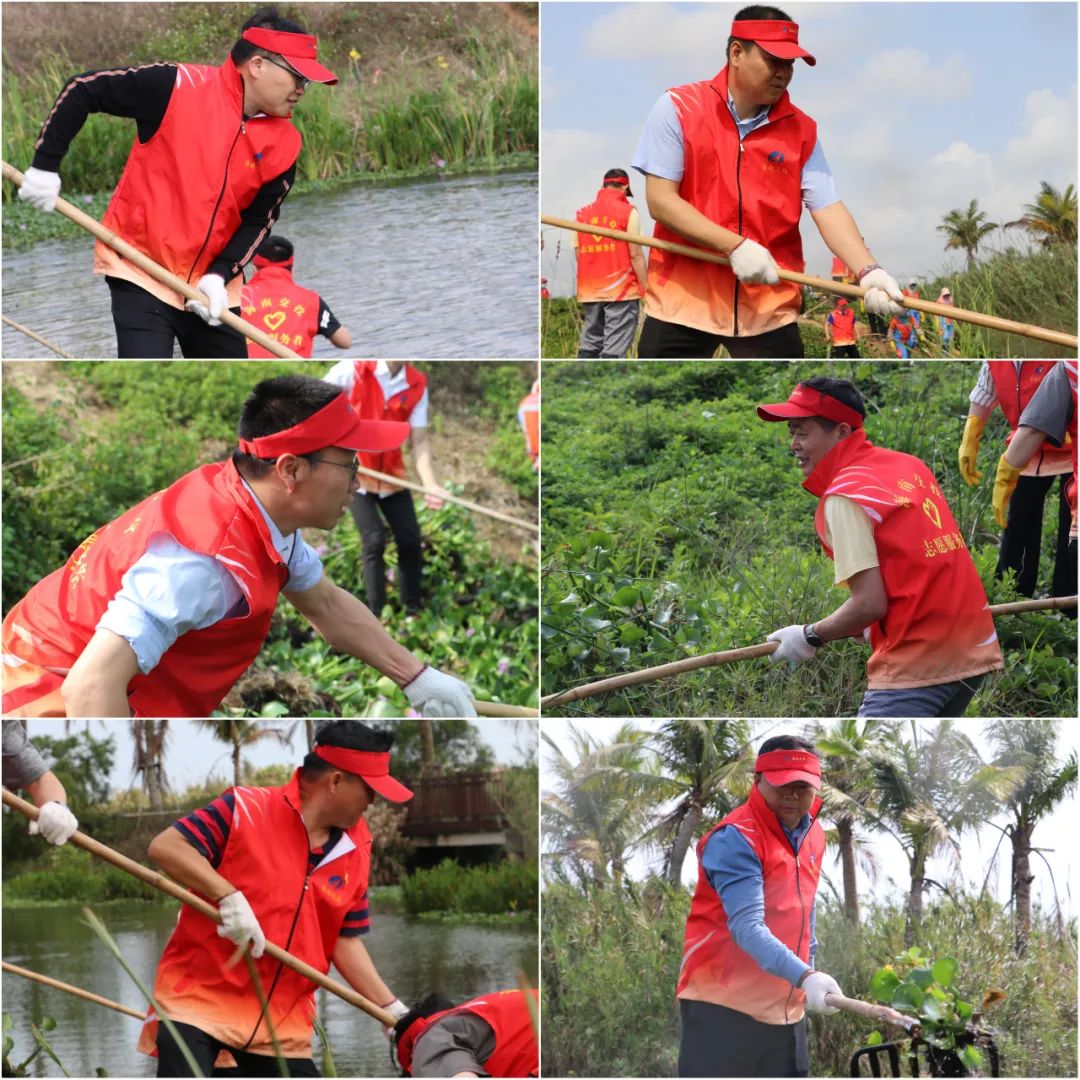 海南交投党委副书记、总经理陈泰锋,党委委员、纪委书记、监察专员郑文海,党委委员、副总经理陈敬带头参加劳动,身穿志愿红,手拎长钉耙,健步走到水边就开捞,与大家一起干得热火朝天。农发行海南省分行党委委员、副行长陈未也亲自带队响应与海南交投的首次党建共建,一道参加劳动。