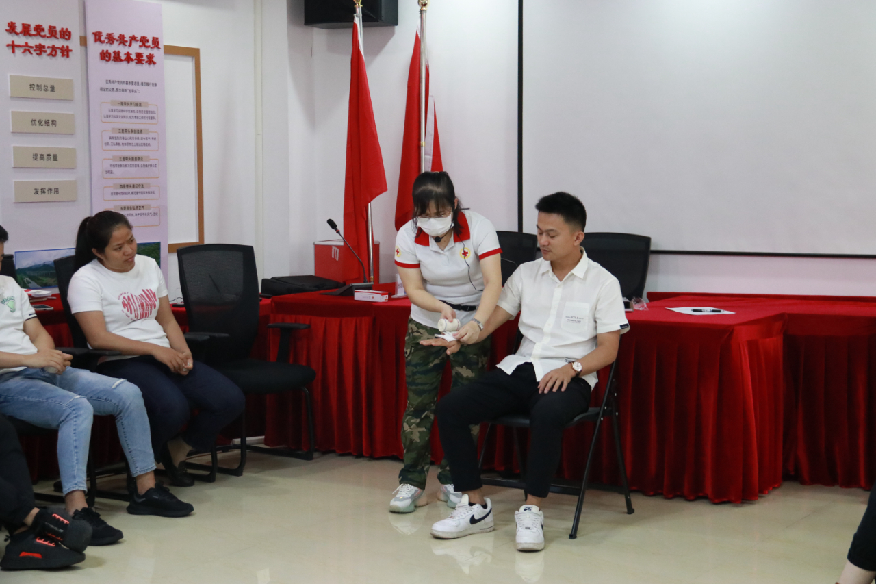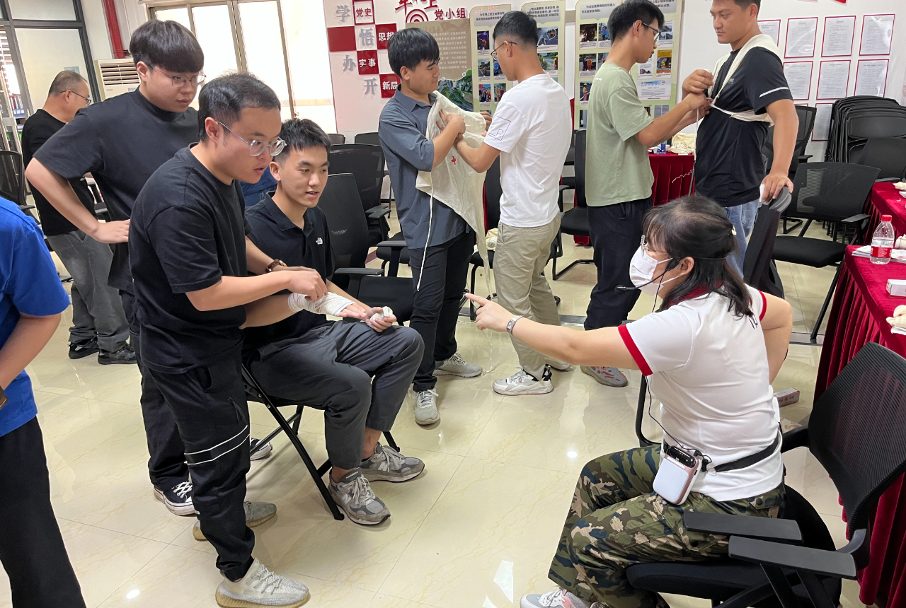 培训的重头戏是应急救护知识实操——心肺复苏术和创伤包扎。心脏复苏实操环节,参训学员认真观摩学习仰头举颏、开放气道、高质量的胸外按压、人工呼吸等心肺复苏技术,培训师们现场对参训学员判断是否丧失意识、有无自主呼吸、胸外心脏按压、清理口腔异物等操作方法逐一进行指导纠正。在创伤包扎实操环节,为更好学习三角巾和绷带的各种包扎技巧,学员们两人一组互相练习,在反复操作中掌握了正确的急救要领。