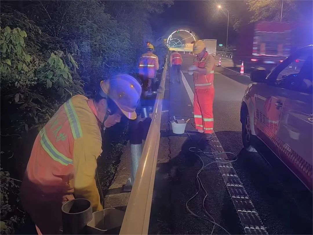 G98环岛高速东线大茅隧道入口附近有一处深涵洞,为防止车辆落入,三亚管理站决定在此处增设护栏。由于大茅隧道附近交通量大,施工极易造成拥堵,且此处地下埋有国防光缆,无法使用大型机械和打桩车安装护栏立柱。多次踏勘研究后,三亚管理站通过在夜间错峰施工,克服路面拥堵问题,采用法兰式立柱支撑护栏,有效避免了对地下光缆的影响。经过5天施工,共增设护栏48m,护栏端头1个,植入法兰式立柱28根。