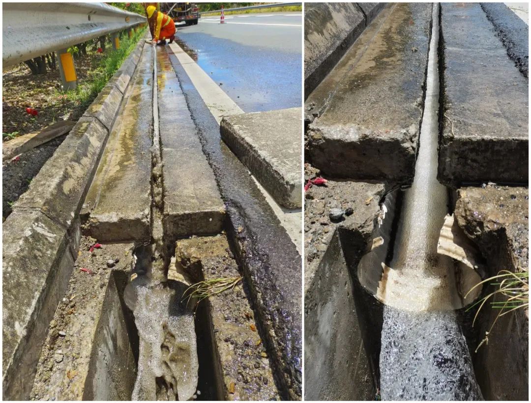 经过系列清淤举措,水车里的水在高压泵的作用下,强有力的从出水口喷射出去,立时便将暗沟内的淤泥杂物冲出,高效地为高速公路畅通了“肠道”,有效缓解了强降雨期间路面积水压力。经过多次工作实践,证实了该方案能大大提高中央分隔带小水沟清淤效率,减少养护工作占道时间,不仅节约了养护成本,还极大提高了安全系数。