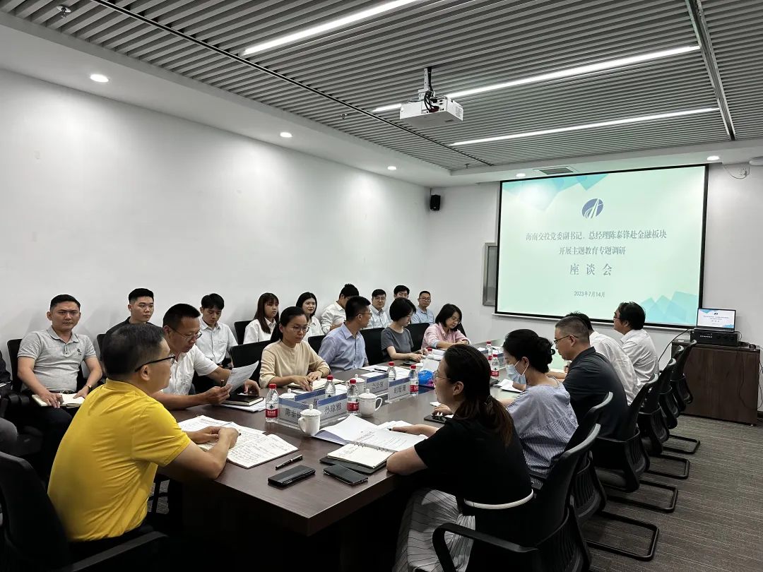 为扎实开展学习贯彻习近平新时代中国特色社会主义思想主题教育,推进以学促干,推动金融板块高质量发展,近日,海南交投党委副书记、总经理陈泰锋赴金融板块开展主题教育专题调研,党委委员、副总经理陈敬及相关部门负责人陪同调研,金融板块全体员工参加调研座谈会。