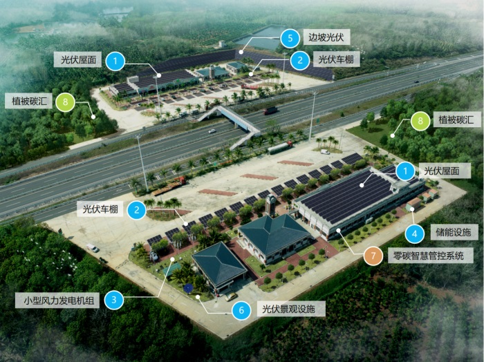 为贯彻落实“双碳”战略目标,助力海南“清洁能源岛”建设,海南交投服务区公司坚持以“低碳建造、零碳运营”为发展目标,通过“交通+新能源”推动公司绿色低碳高质量发展。2023年5月31日,海南省首个高速公路零碳服务区示范项目在冯家湾服务区正式启动建设,建成后将实现服务区内碳排放和减排、碳汇吸收自我平衡,达到服务区运营的中短期碳中和,达成“低碳建造、零碳运营”发展目标。