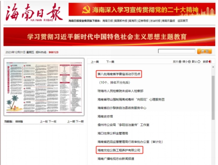 11月30日晚,由中共海南省委宣传部海南省文明办主办的“磅礴的力量”海南省2023年精神文明建设先进典型表彰发布仪式在海口举行,海南交投旗下养护公司获评“第八批海南省学雷锋活动示范点”,是海南国资系统仅有的2家荣获表彰公司之一。