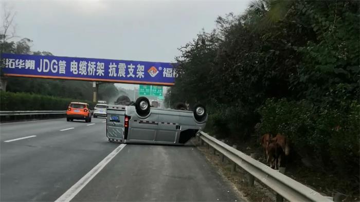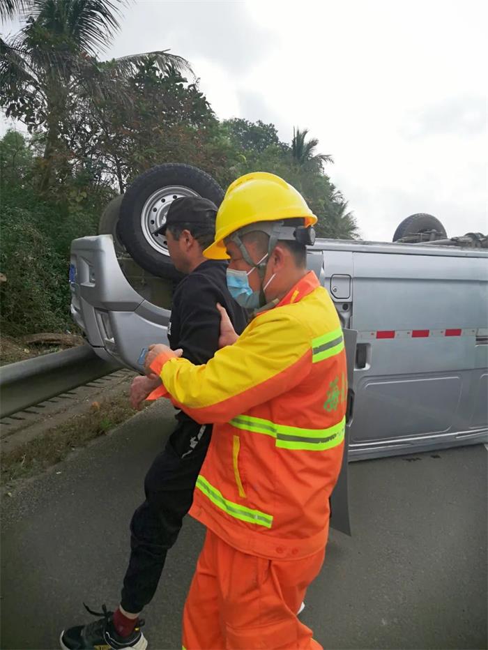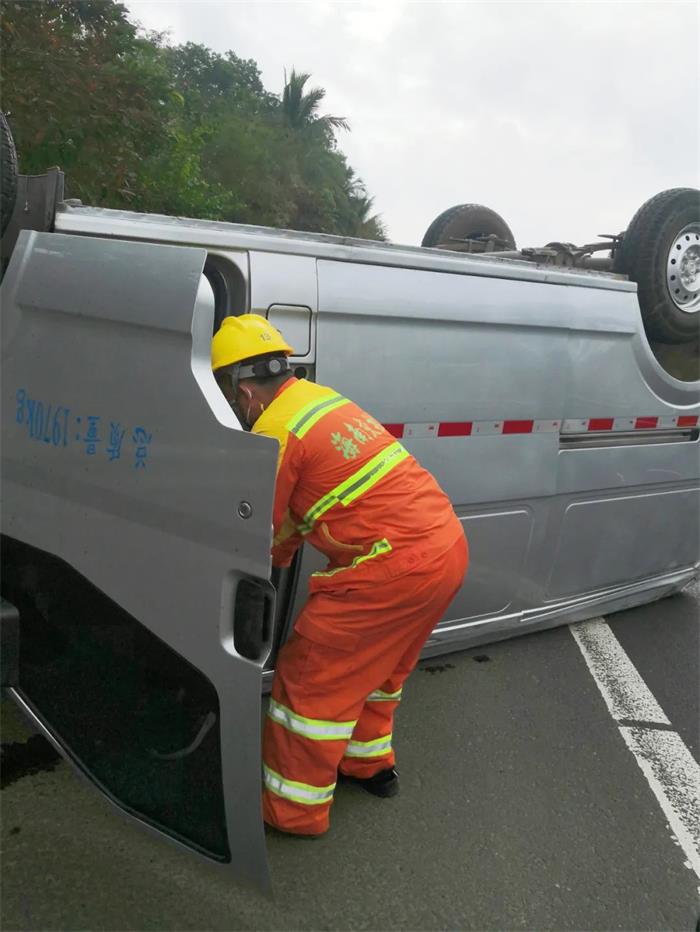 日前,海南交投养护公司定安管理站养护人员陈高文和2名工人在收工途经G98海南环岛高速海口往三亚方向38公里附近,目睹了一辆小货车连续翻滚两圈,最后车轮朝天,仰翻横跨在应急车道和行车道上。