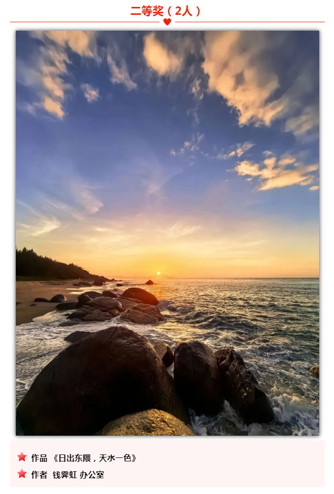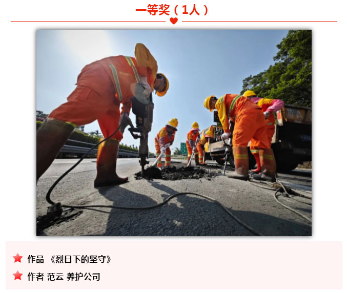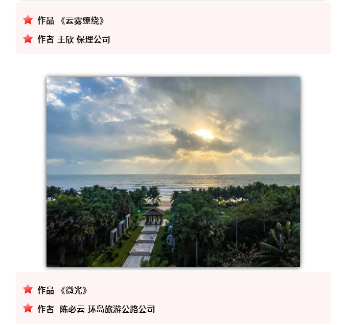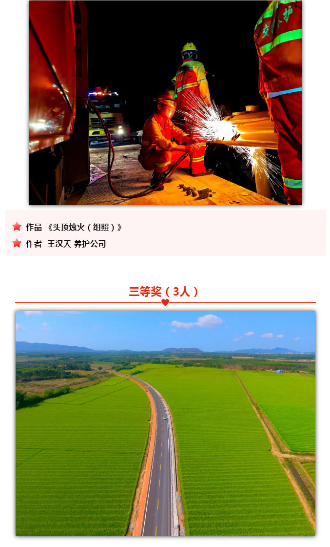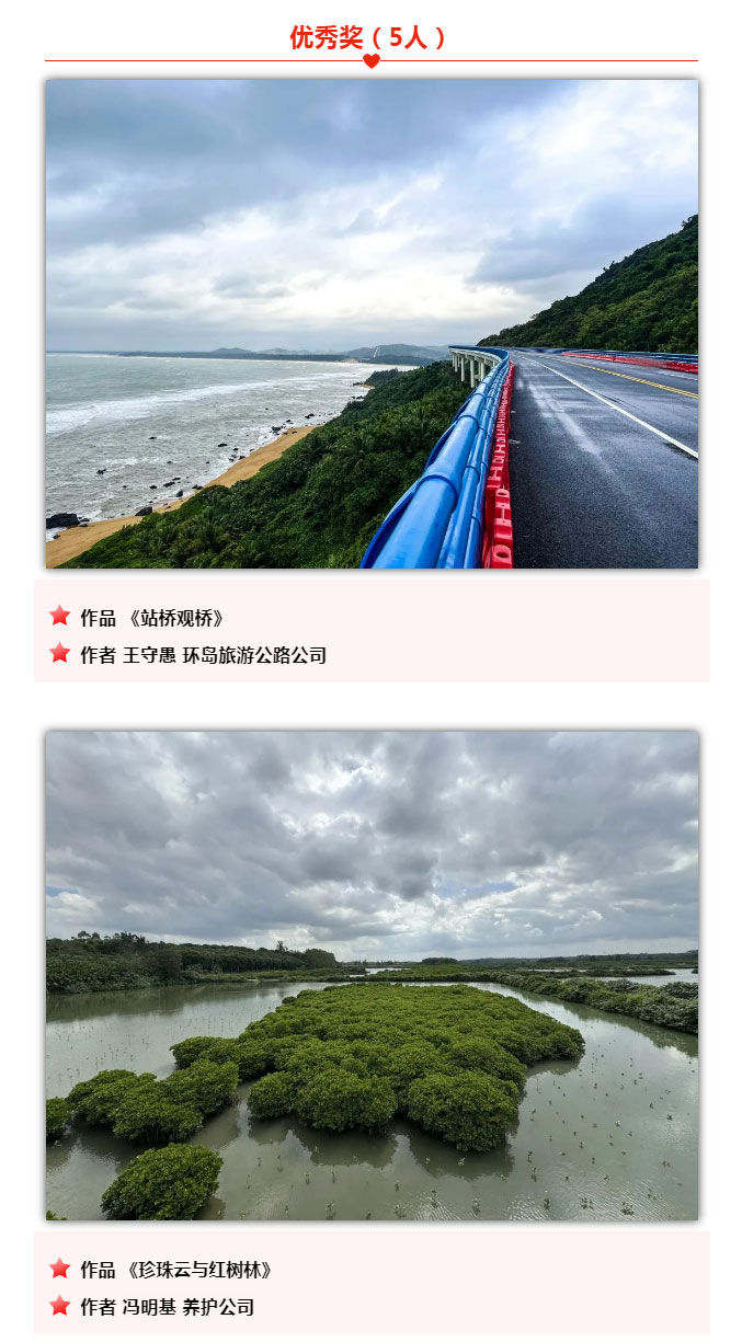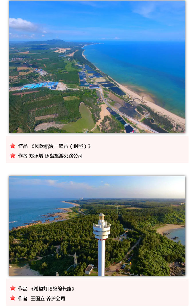 为庆祝海南环岛旅游公路全线建成通车,海南交投举办了首届“环岛杯”摄影大赛活动。各部门、下属单位积极响应、广泛参与,共征集到投稿摄影作品47份。通过邀请专业评委和公司领导评审,采取匿名评选的做法,共评选出摄影一等奖作品1份、二等奖作品2份、三等奖3份、优秀奖5份,有展现道路建设者风采的,有展示项目建设成就的,有呈现旅游公路沿线优美自然风光的,各美其美,从各个角度充分展现了海南交投人众志成城、攻坚克难、担当作为、创新竞进的精神风貌。