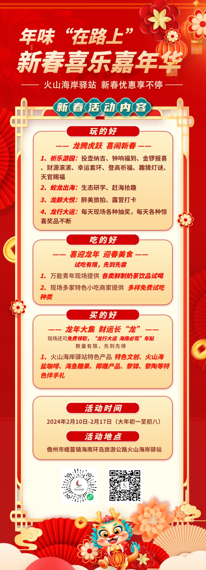 品味千年儋州古郡,探秘万年火山海岸。儋州火山海岸驿站位于儋州市峨蔓镇,以“火山”为主题,有机串联周边的火山海岸地质公园、红树石趣、龙门激浪、情人湾等观景平台,巧妙地把公路沿线自然景观与驿站业态紧密融合一起,既展现了火山的雄浑壮美,又体现了水火交融的热带海岸的神奇与浪漫风情。驿站春节期间推出的“龙年春节喜乐嘉年华”的主题活动,内容丰富,趣味多多,诚邀您来打卡!