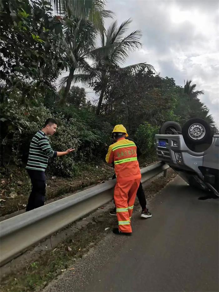 定安站“车轮上党小组”陈高文和2名工人紧急救助翻车受困车主。