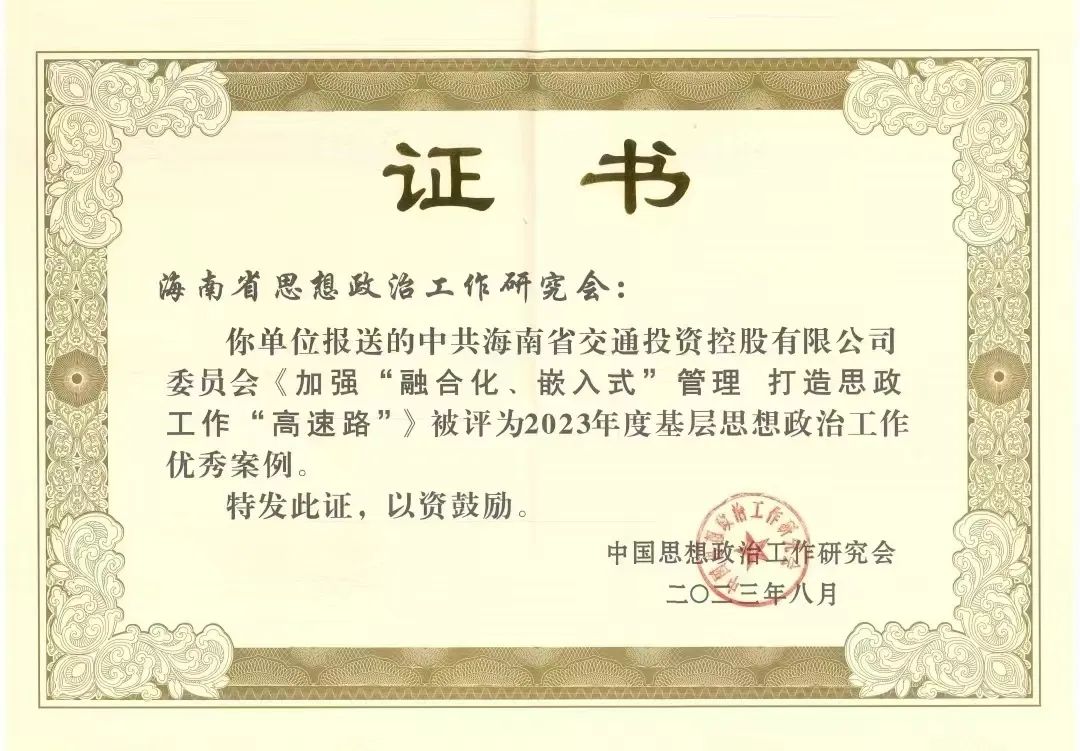 着力抓学习强思想,把稳政治思想“领航舵”。海南交投党委严格执行“第一议题”和理论学习中心组专题学习制度,举办“交投大讲堂”、读书班,赴省委党校开展“全覆盖”封闭培训,深入学习贯彻习近平总书记重要讲话和重要指示批示精神、党的二十大精神等。对标“严实效”要求,扎实开展主题教育,实施“边查边改边推进”动态管理,推动发展、我为群众办实事、问题整改“三张清单”高质高效完成,主题教育工作被省委指导组评估为“好”,“调查研究”“以学促干”等做法在全省主题教育简报及海南日报等媒体进行报道。实施“融合化、嵌入式”举措,公司党委思想政治工作获评全省唯一的2023年度全国优秀案例。△海南交投党委《加强“融合化、嵌入式”管理 打造新时代思想政治工作“高速路”》成功入选全国思想政治工作优秀案例,系我省唯一。着力抓队伍促发展,打造党建驱动“强引擎”。海南交投党委坚持五湖四海、广纳贤才,在人才引进、选拔任用、引育并举上下功夫,扎实开展先锋党员“四争”创建活动,激励党员干部充分发挥先锋模范作用,推动党建与生产经营深度融合。“传世之作”环岛旅游公路提前实现全线通车,“火山海岸”驿站建成运营;“二线口岸”专用通道、鹦哥岭隧道等重点项目顺利开工;推动投融资体制改革取得新突破,洋浦疏港高速公路项目创新实施“施工总承包+股权投资”;着力发展“服务区+新能源”,建成全省首个零碳服务区、首个液冷超充站;养护公司取得海南全序列最高等级养护资质,管辖路段公路技术状况指数达96.68%,被评为“全省应急保通先进单位”。积极开展“包镇帮扶”专项试点工作,公司荣获省乡村振兴先进派出单位,年度工作综合评定为“好”。
