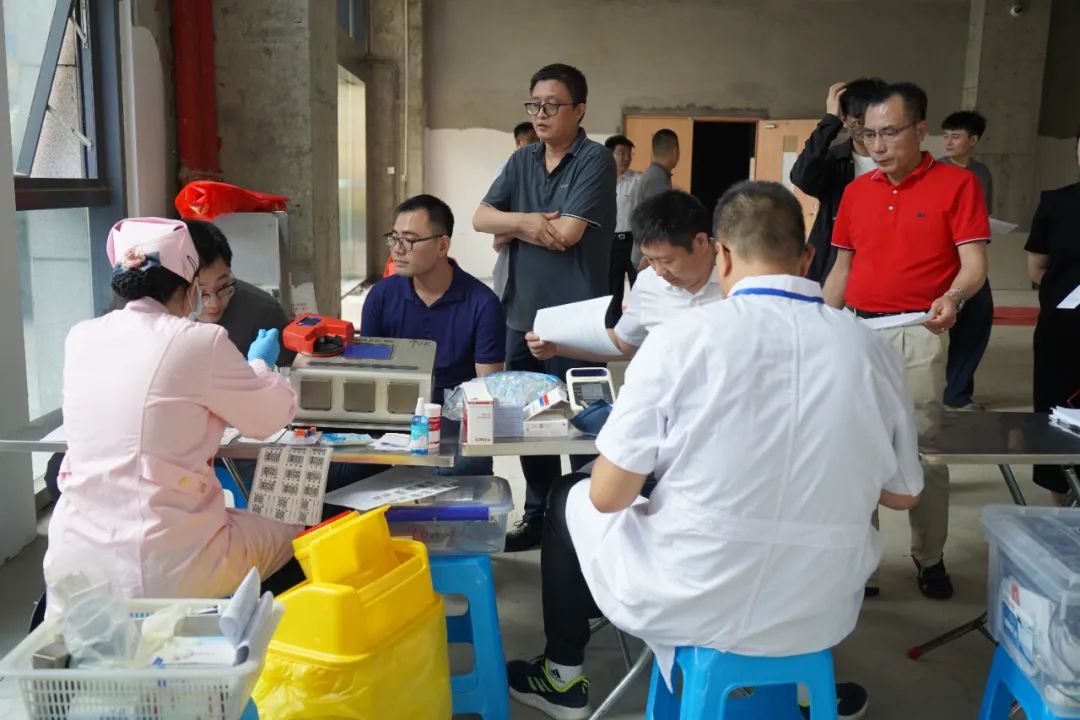 △公司干部职工配合医务人员进行血压测量、血样化验等监测环节