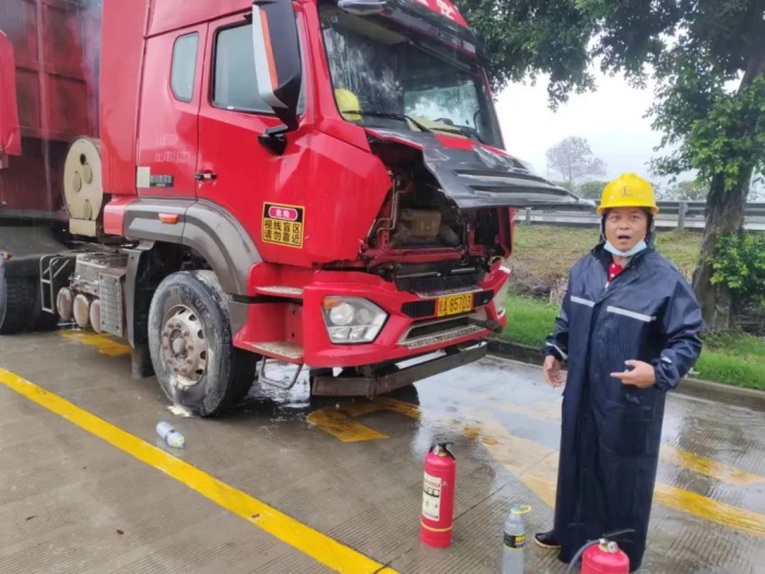 2023年6月11日,交控石化屯昌服务区(西)加能站,员工何发鑑在加能站旁停车区处置物流车辆火情,展现出了恪尽职守、勇于担当的精神。