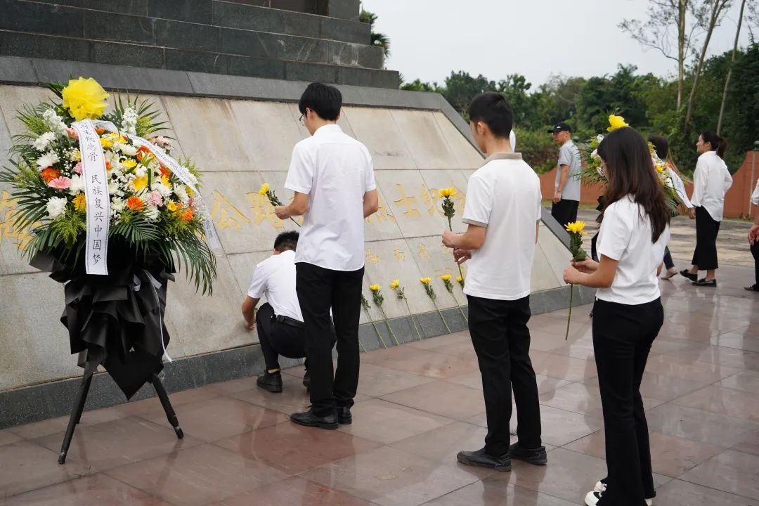 全体人员面向纪念碑,整齐列队、整衣敛容、肃然而立,向烈士默哀、鞠躬。