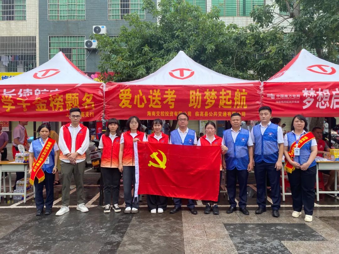 在爱心送考之余,投资公司党支部还在临高中学门口搭建“志愿服务摊位”,为考生们送上定制的爱心送考环保袋、励志扇子、矿泉水等物品,让考生在炎热的夏日感受到一丝清凉和关爱,并预祝考生“十年寒窗,一朝金榜题名!”
