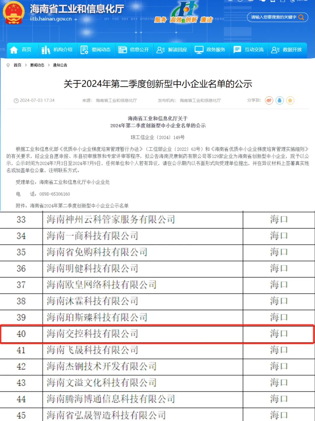 近日,根据工业和信息化部《优质中小企业梯度培育管理暂行办法》(工信部企业〔2022〕63号)和《海南省优质中小企业梯度培育管理实施细则》的有关要求,经企业自愿申报、市县初审推荐和专家评审等程序,海南交控科技有限公司(以下简称交控科技)成功入选2024年第二季度创新型中小企业名单。