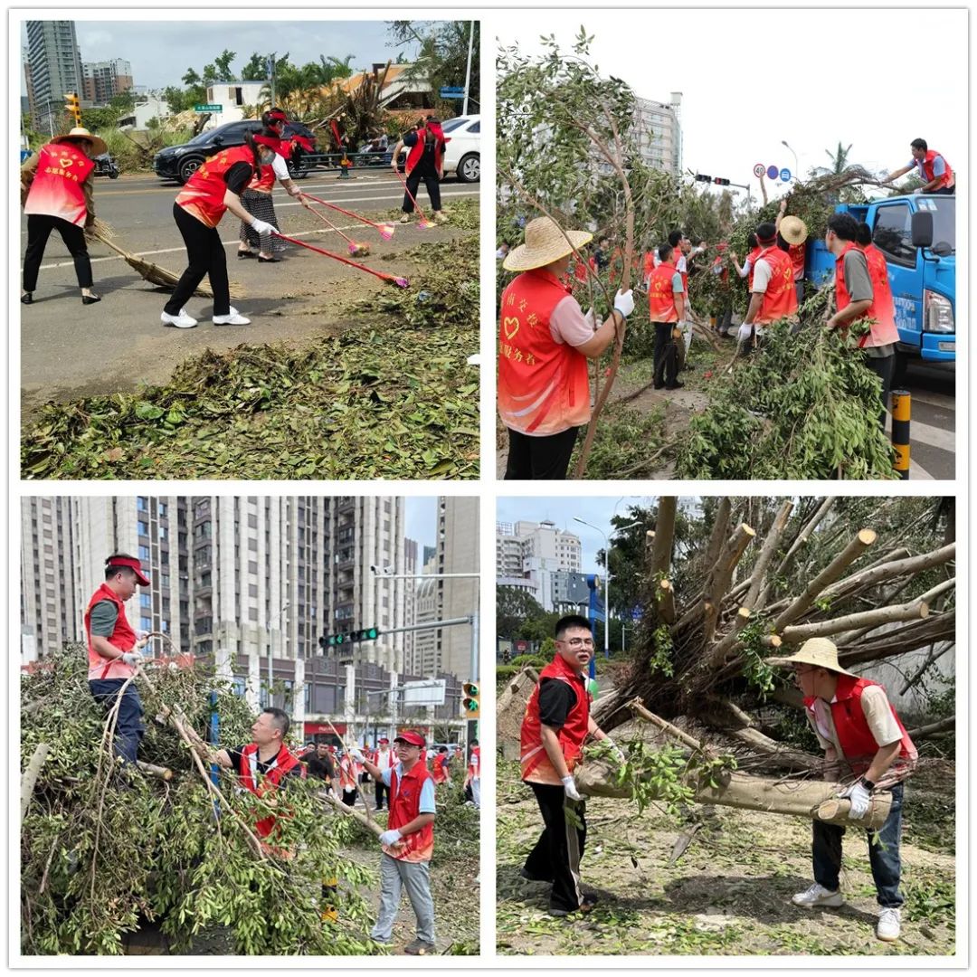 在大英山西四路与大英山西二街交汇路口,受台风影响,随处可见路旁树木倒伏,树叶、垃圾散落,交通受阻较为严重,急需救援力量。海南交投党员志愿服务队到达现场后,分成5组,积极配合社区工作人员,在附近路段开展道路清障、树木搬运和垃圾清扫工作。烈日当空,志愿者们肆意挥洒汗水,虽身体疲惫,但热情始终高涨,只见他们分工明确,热火朝天,有的使用电锯等工具对倒伏的树木进行分段切割、修枝,有的将木块、树杈搬运装车,有的将落叶垃圾清扫成堆,同时还化身交通劝导员,提醒过往司乘人员注意安全。