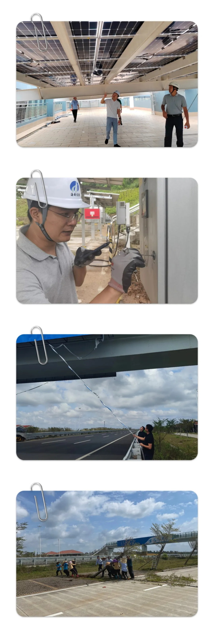 随着台风“摩羯”过境,交商集团第一时间对各服务区、莺歌海光伏电站、充电场站、分布式光伏运营项目及在建项目全面进行灾后检查,迅速、有序地开展服务区、项目现场清理及加能、充电设备恢复工作,对可能造成二次灾害的区域,视情况加固或拆除,无法及时处理的区域进行封锁并做好告示,保证断电服务区发电机柴油供应充足,同时在保证安全的前提下有序恢复在建项目施工。截至目前,交商集团所辖服务区加油站及商超等业态均已正常对外营业,停车区、公共厕所等服务设施均已开放,高速公路服务区、环岛旅游公路停车区等共计10个场站充电桩已上线运行,有效保障过往司乘出行需求。