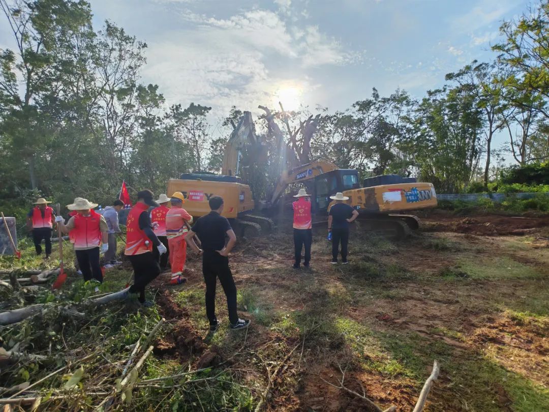 两株古树分别为榕树“子母树”、红佳木,保护等级均为三级,树龄加起来超过300年,却在台风“摩羯”肆虐下完全倾倒,受损严重。海南交投志愿服务队南宝镇中队得知情况后,第一时间会同县林业局工作人员赶赴现场,查看古树受损情况,并结合受损情况紧急制定科学可行的扶正抢救方案,确定了修枝、清障、施药、起重、支撑等各项要素,既保证及时扶正,又保证存活。同时联系海南交投洋浦港高速公司财务总监梁昕,协调洋浦疏港高速公路施工单位中交一公局、龙建路桥公司调配2台大型挖机进场作业。