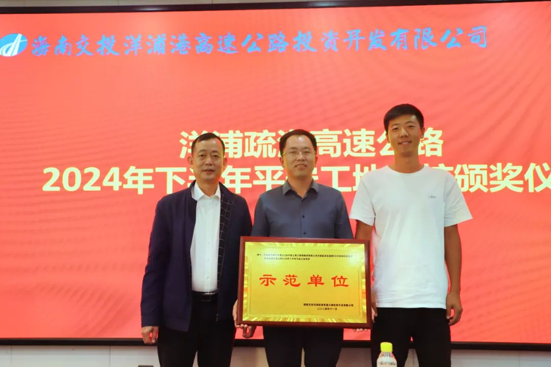 会上,还举行了洋浦疏港高速公路2024年下半年平安工地考核颁奖仪式,SG01标段项目经理部获“示范单位”荣誉称号,吴卓科为获奖单位颁发了荣誉证书和奖牌。