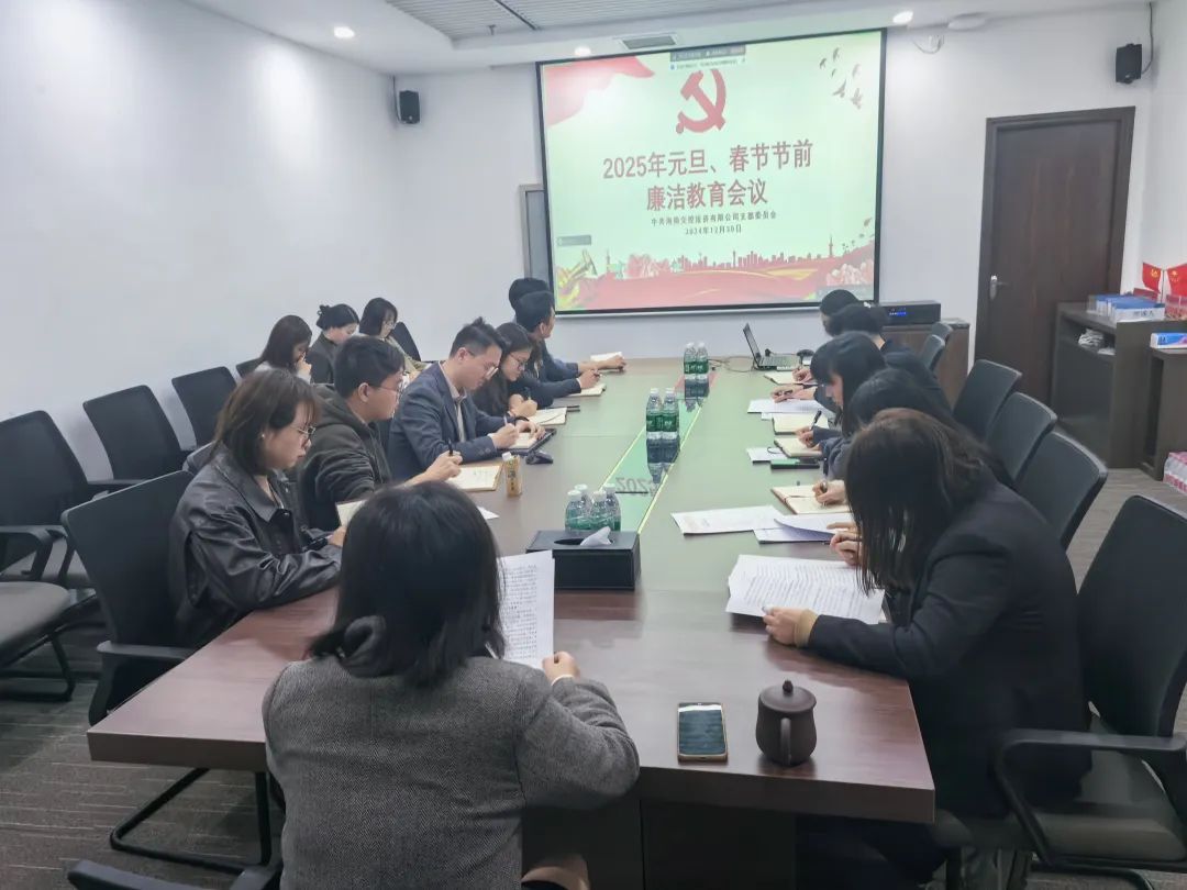 12月30日上午,海南交投投资公司召开2025年元旦春节节前廉洁教育会议,传达学习习近平总书记关于纪律教育的重要论述精神、中央八项规定及实施细则等,通报十二起违反中央八项规定精神、群众身边不正之风和腐败问题案件,集中观看了警示教育片《警钟长鸣|欲随权涨 迷失心智》《案鉴|“我奋斗了三十多年,但现在却一无所有了”》。纪检委员孙琼雅主持会议并作廉洁谈话,金融板块全员参会。
