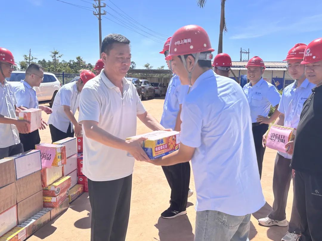 慰问组将王老吉、菊花茶、凉粉等防暑物资送到职工手中,并致以诚挚问候。伋兴春对建设者顶烈日、战酷暑的奉献精神给予高度肯定,同时强调:“高温天气是安全生产的关键期,项目部要科学调整作业时间,落实防暑降温措施,严格执行应急预案,确保职工健康与施工安全‘双保障’。”