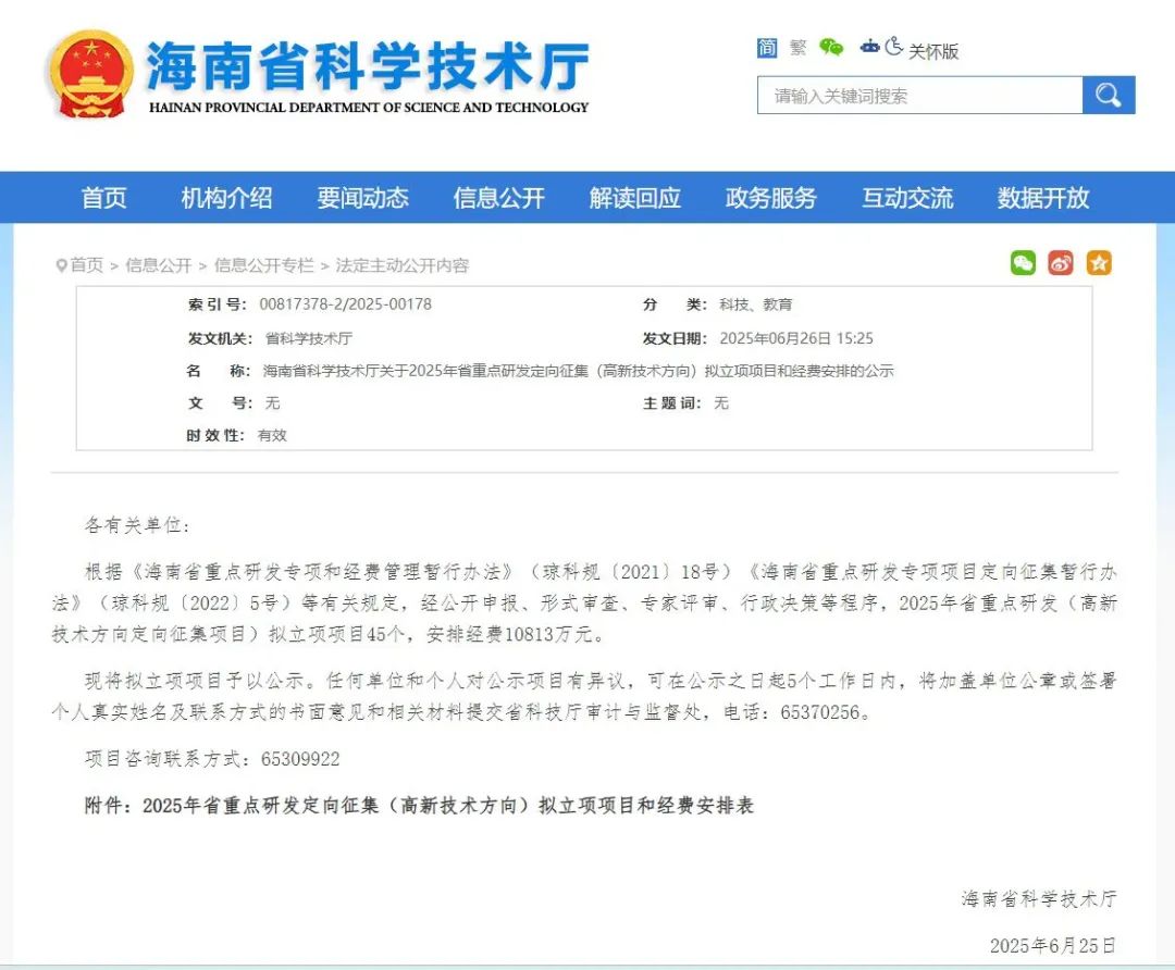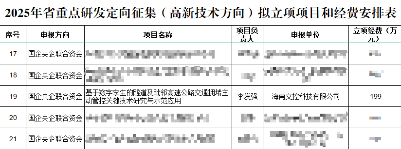 近日,海南省科学技术厅公布了《关于2025年省重点研发定向征集(高新技术方向)拟立项项目和经费安排的公示》,由海南交投旗下海南交控科技有限公司(以下简称“交控科技”)联合长安大学、交通运输部路网监测与应急处置中心,共同申报的“基于数字孪生的隧道及毗邻高速公路交通拥堵主动管控关键技术研究与示范应用”项目成功入选公示名单。
