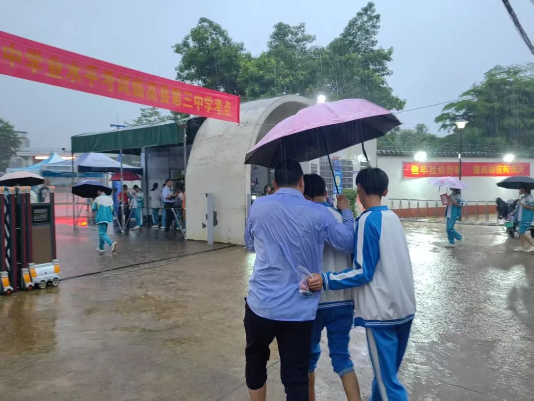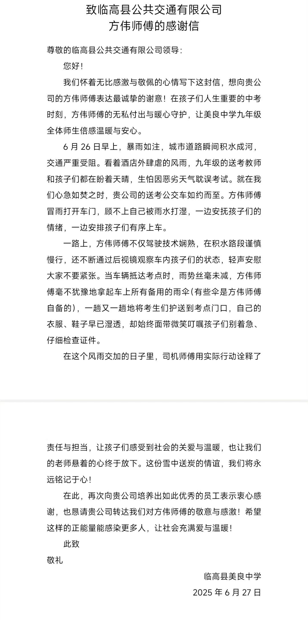 最令人动容的是车辆抵达考点的时刻,雨势丝毫未减方伟师傅迅速拿出车内所有备用雨伞,甚至包括自己平日使用的伞具,在滂沱大雨中往返于车门与考点入口之间。他弯腰为考生撑起伞面,自己的后背却被暴雨浇透;他踩着湿透的鞋袜在积水中奔走,却始终用微笑叮嘱“检查好证件,别着急”。当最后一名考生安全进入考场,他才发现自己的制服早已能拧出水来,而孩子们转身时那句“谢谢师傅”,却让他觉得所有的奔波都有了意义。