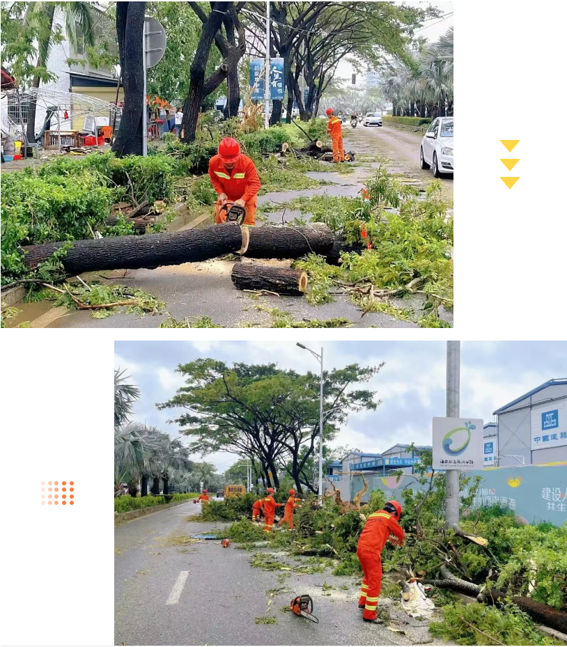 清理倒伏树木、疏通路面障碍、处理潜在险情……面对台风过境后的满地狼藉,在G98三亚环岛高速公路、互通匝道及市区交通干线等受灾区域路段,海南高速养护人那一抹抹“橙色”的身影正争分夺秒地奋战在公路抢通保畅的第一线。