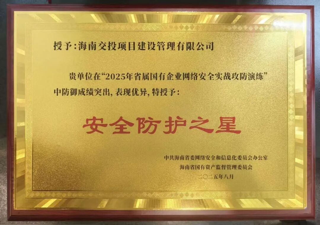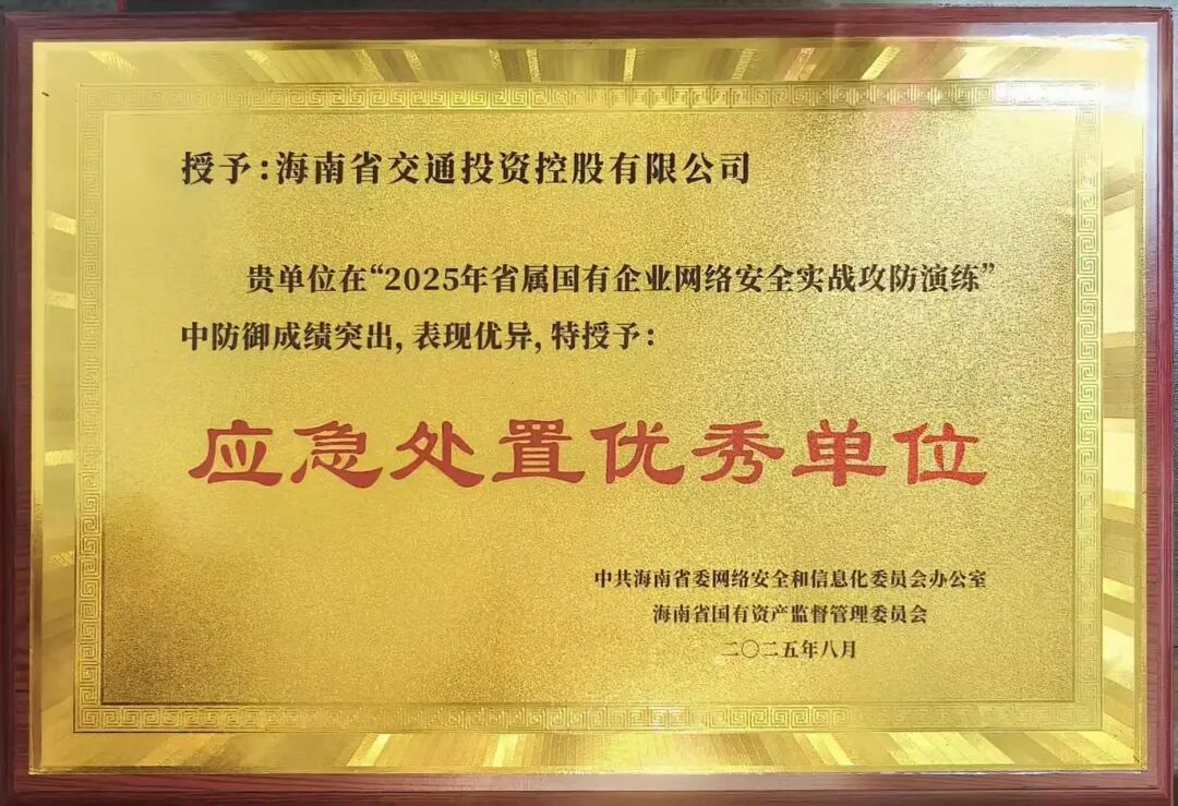近日,从中共海南省委网络安全和信息化委员会办公室、海南省国有资产监督管理委员会传来喜讯,海南交投及下属单位省交规院、交投项目公司,在2025年省属国有企业网络安全实战攻防演练活动中,凭借出色的安全防护能力、快速的应急响应机制和卓越的团队协作精神,分别获评“应急处置优秀单位”“安全防护之星”荣誉称号。