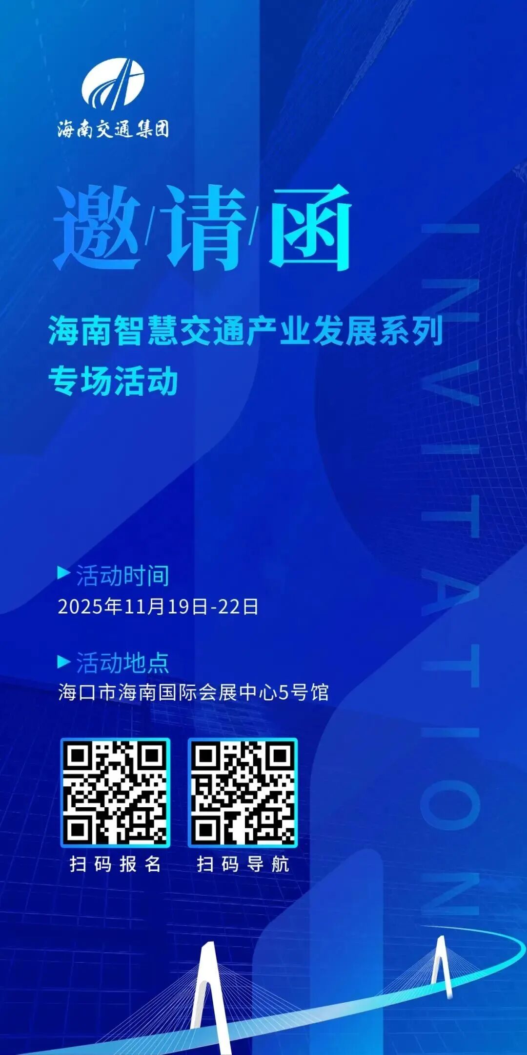 11月14日,海南日报全媒体记者从海南省交通投资集团有限公司(以下简称海南交通集团)获悉,2025第二十届中国智能交通大会期间将举办海南智慧交通产业发展专场活动,海南交通集团已正式发出“邀请函”,报名工作正式启动,诚邀关心支持海南智慧交通事业的各界有识之士参与,共绘海南数智交通新蓝图。