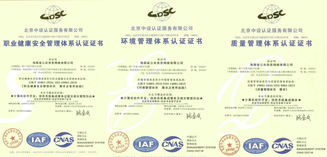 海南交通集团旗下海南省公共信息网络有限公司(以下简称“公网公司”)担任着集团交通领域数字化转型的重要任务。近日,公网公司成功通过ISO9001(质量管理体系)、ISO14001(环境管理体系)、ISO45001(职业健康安全管理体系)和ITSS 3级、ISO20000(信息技术服务管理体系)、ISO27001(信息安全管理体系)六大权威资质认证,标志着公网公司在标准化、规范化、精细化管理及信息技术服务能力和体系建设等方面迈上了新台阶,提升了公网公司的品牌形象和美誉度,为公网公司参与市场竞争和拓展业务创造了良好条件。