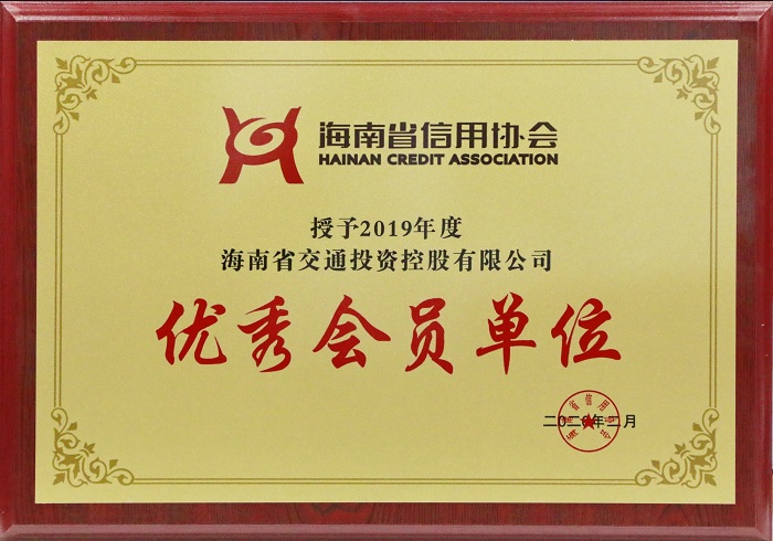 近日,海南省信用协会授予海南交控“2019年度优秀会员单位”。这是海南交控在企业信用与社会责任方面获得的又一荣誉,是对海南交控企业形象的充分肯定,也是对海南交控致力于社会和谐发展、努力承担社会责任的褒奖。